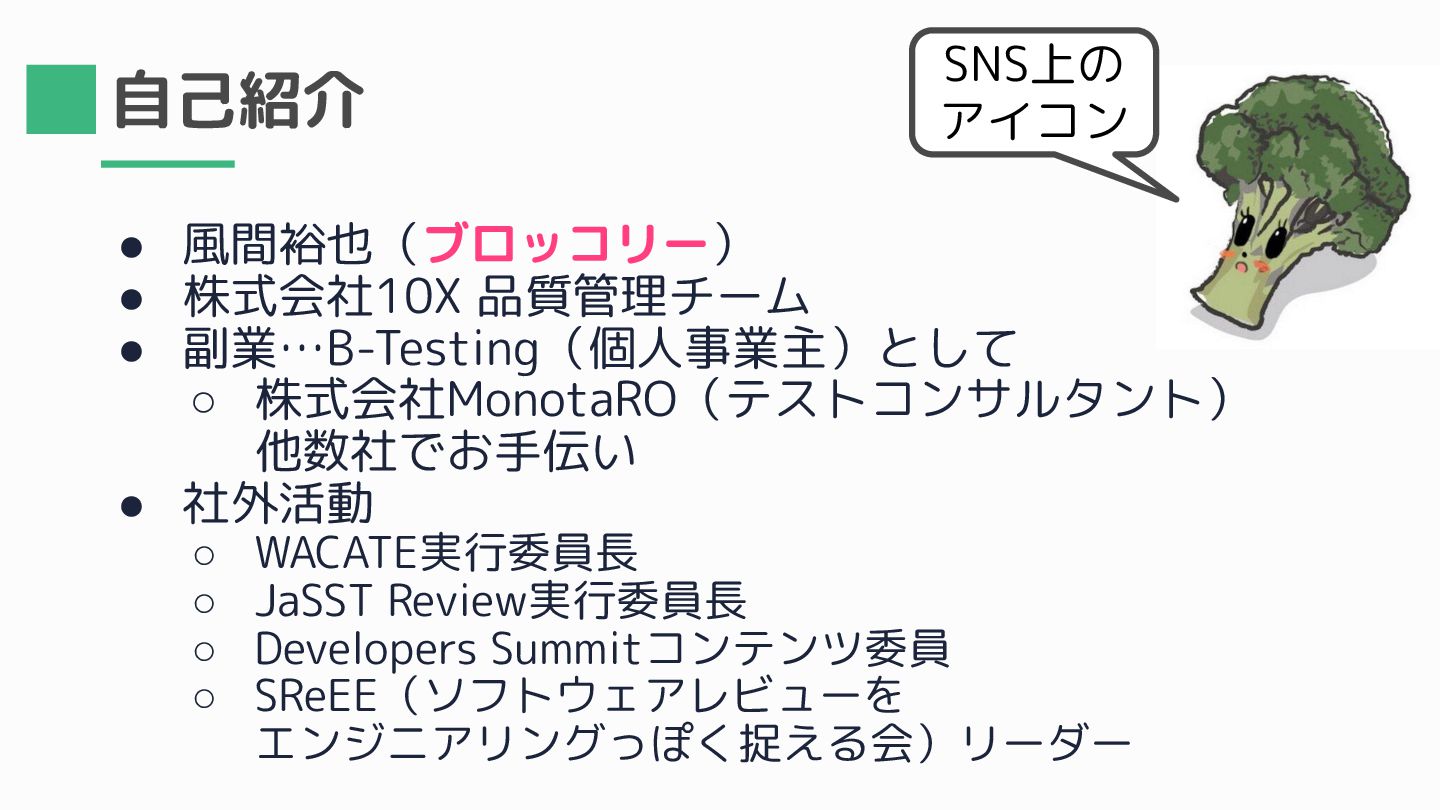 自己紹介 • 風間裕也(ブロッコリー) • 株式会社10X 品質管理チーム • 副業…B-Testing(個人事業主)として ◦ 株式会社MonotaRO(テストコンサルタント)