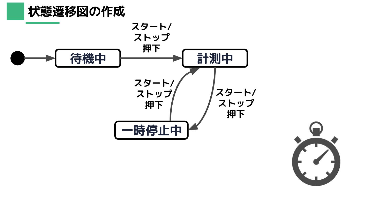 状態遷移図の作成 待機中 計測中 一時停止中 スタート/ ストップ 押下 スタート/ ストップ 押下