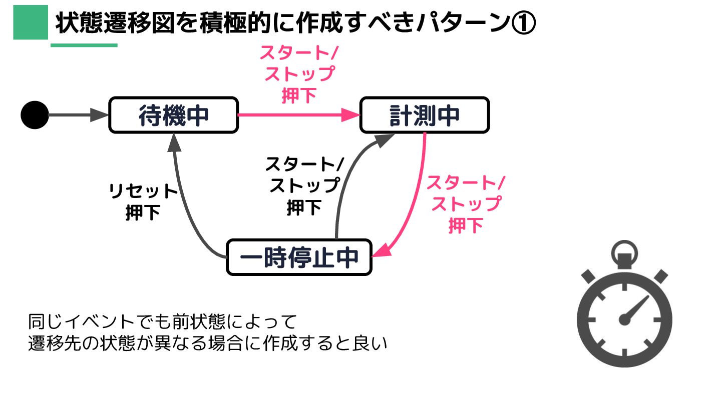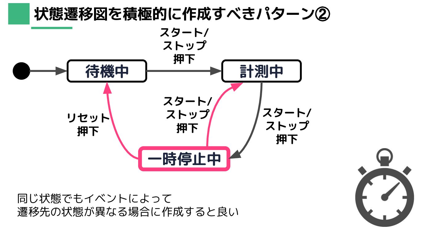 状態遷移図を積極的に作成すべきパターン① 待機中 計測中 スタート/ ストップ 押下 一時停止中 同じイベントでも前状態によって 遷移先の状態が異なる場合に作成すると良い スタート/