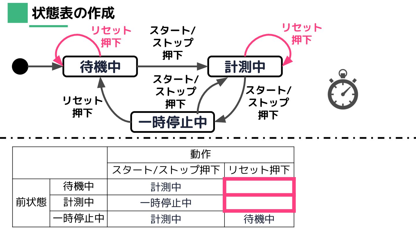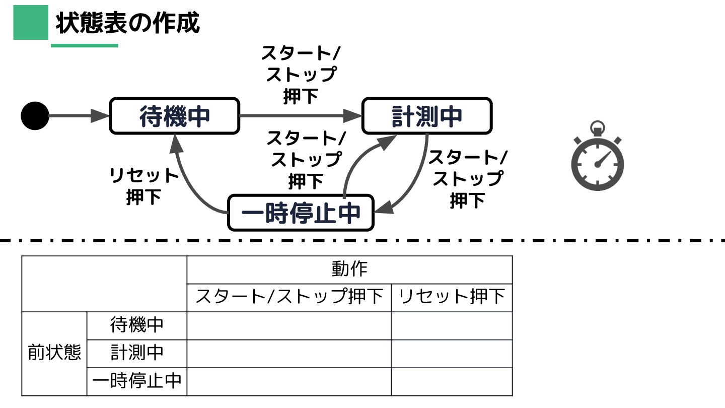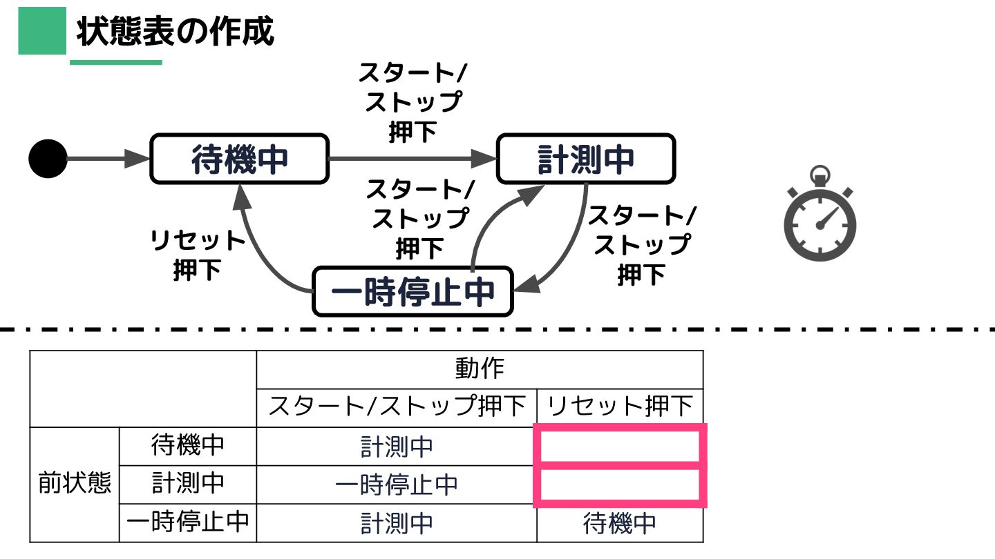 2 0:00で停止している リセットボタン押下 0:00で停止したままになる 3 カウントアップしている スタート/ストップ ボタン押下 押した瞬間の時間で カウントが止まる 4 カウントアップしている リセットボタン押下 何も変わらず カウントアップし続ける 5 0:05で停止している スタート/ストップ ボタン押下 0:05からカウントアップが 再開する 6 0:05で停止している リセットボタン押下 0:00に変化し、停止している 状態遷移図や状態表では 表現できていない部分