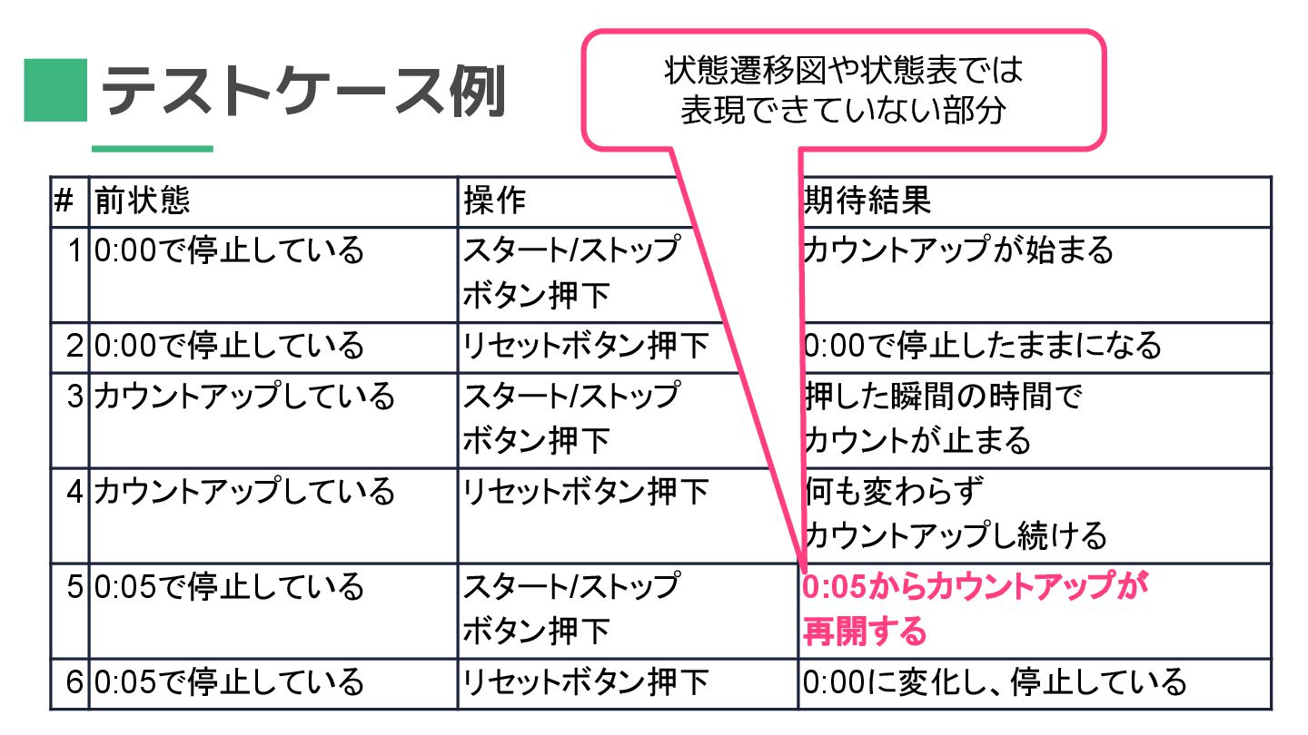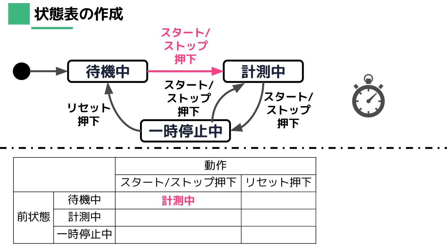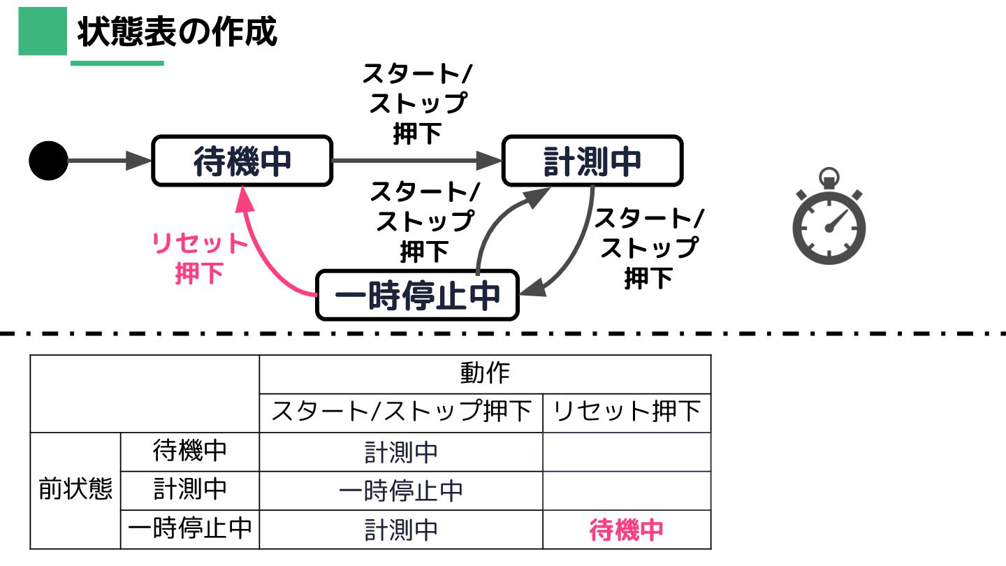 2 0:00で停止している リセットボタン押下 0:00で停止したままになる 3 カウントアップしている スタート/ストップ ボタン押下 押した瞬間の時間で カウントが止まる 4 カウントアップしている リセットボタン押下 何も変わらず カウントアップし続ける 5 0:05で停止している スタート/ストップ ボタン押下 0:05からカウントアップが 再開する 6 0:05で停止している リセットボタン押下 0:00に変化し、停止している 状態遷移図や状態表では 表現できていない部分