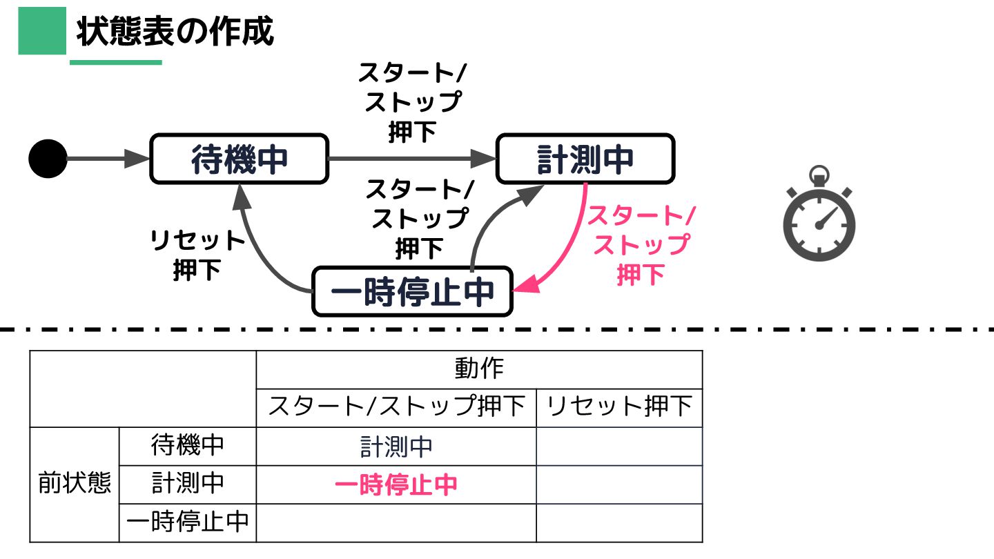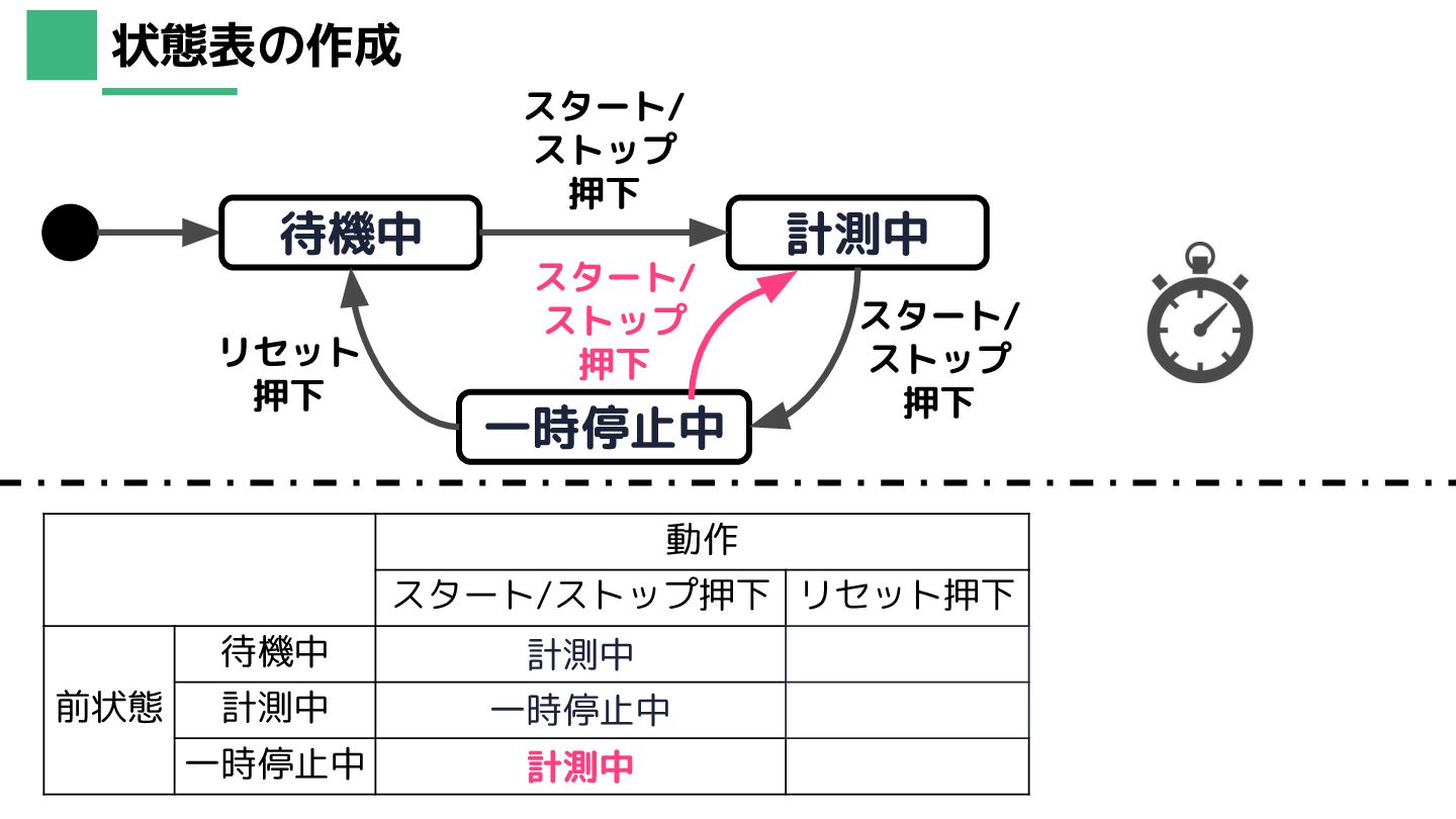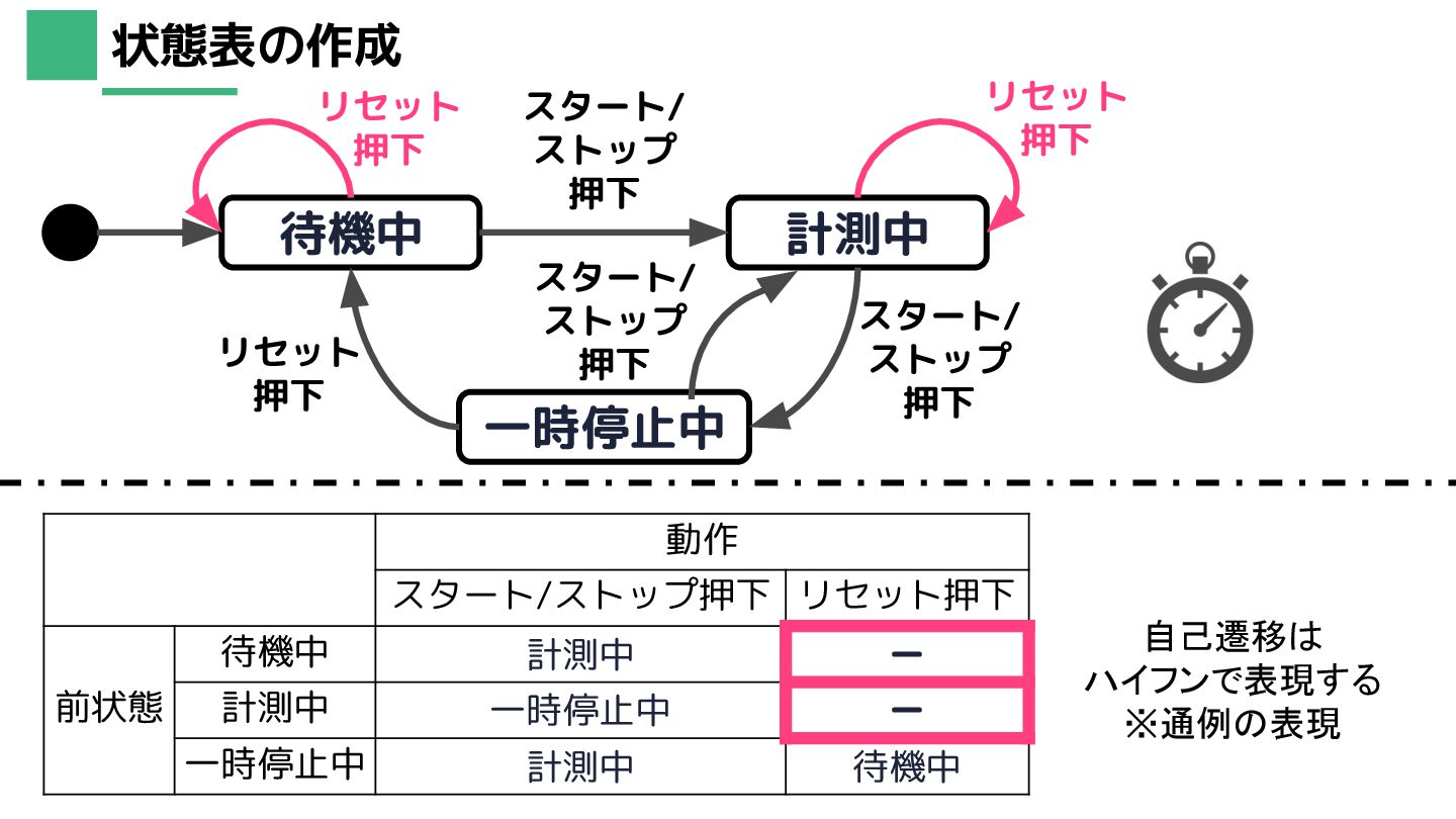 スタート/ ストップ 押下 リセット 押下 リセット 押下 リセット 押下 自己遷移は ハイフンで表現する ※通例の表現 動作 スタート/ストップ押下 リセット押下 前状態 待機中 計測中 ー 計測中 一時停止中 ー 一時停止中 計測中 待機中
