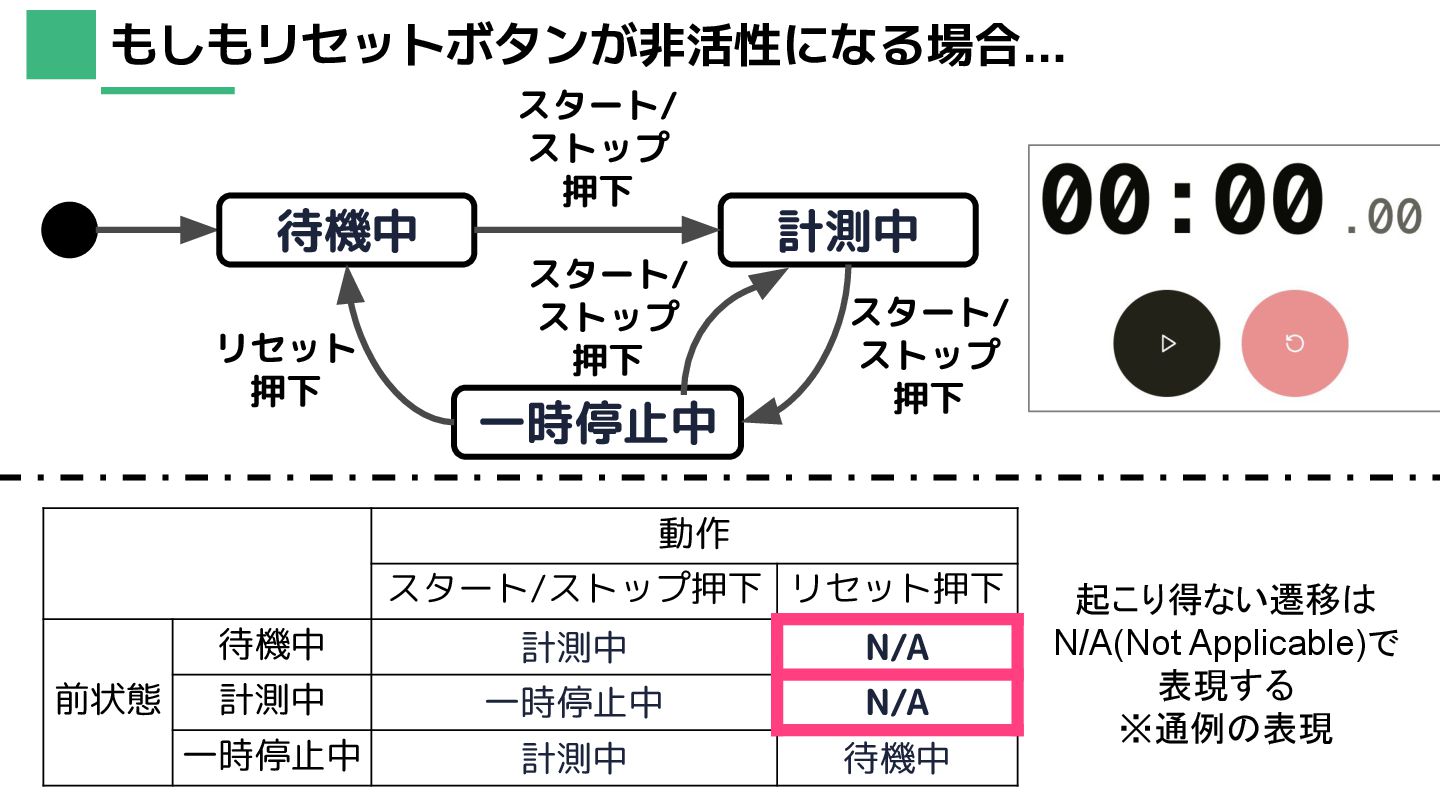 N/A 一時停止中 計測中 待機中 待機中 計測中 スタート/ ストップ 押下 一時停止中 スタート/ ストップ 押下 スタート/ ストップ 押下 リセット 押下 起こり得ない遷移は N/A(Not Applicable)で 表現する ※通例の表現