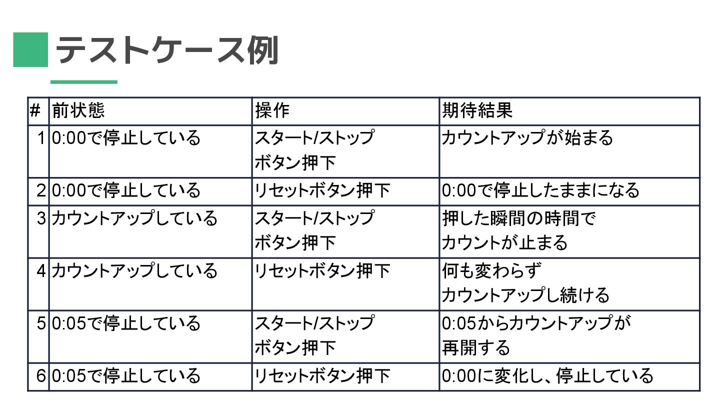 テストケース例 # 前状態 操作 期待結果 1 0:00で停止している スタート/ストップ ボタン押下 カウントアップが始まる