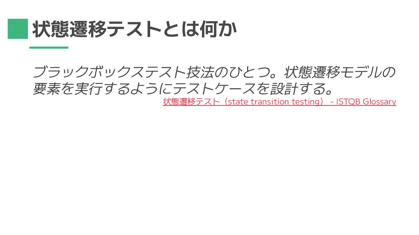 状態遷移テストとは何か ブラックボックステスト技法のひとつ。状態遷移モデルの 要素を実行するようにテストケースを設計する。 状態遷移テスト(state transition testing) - ISTQB Glossary