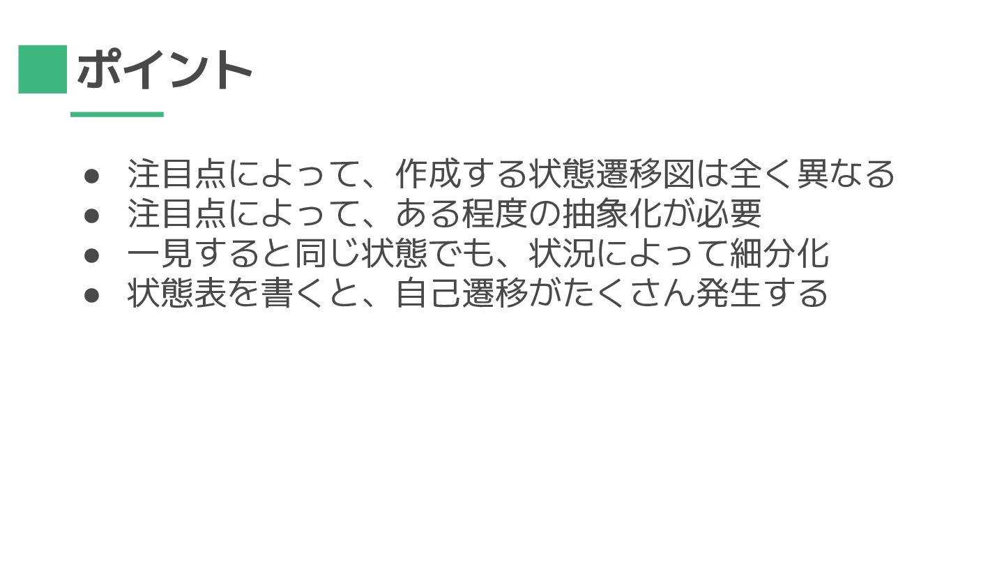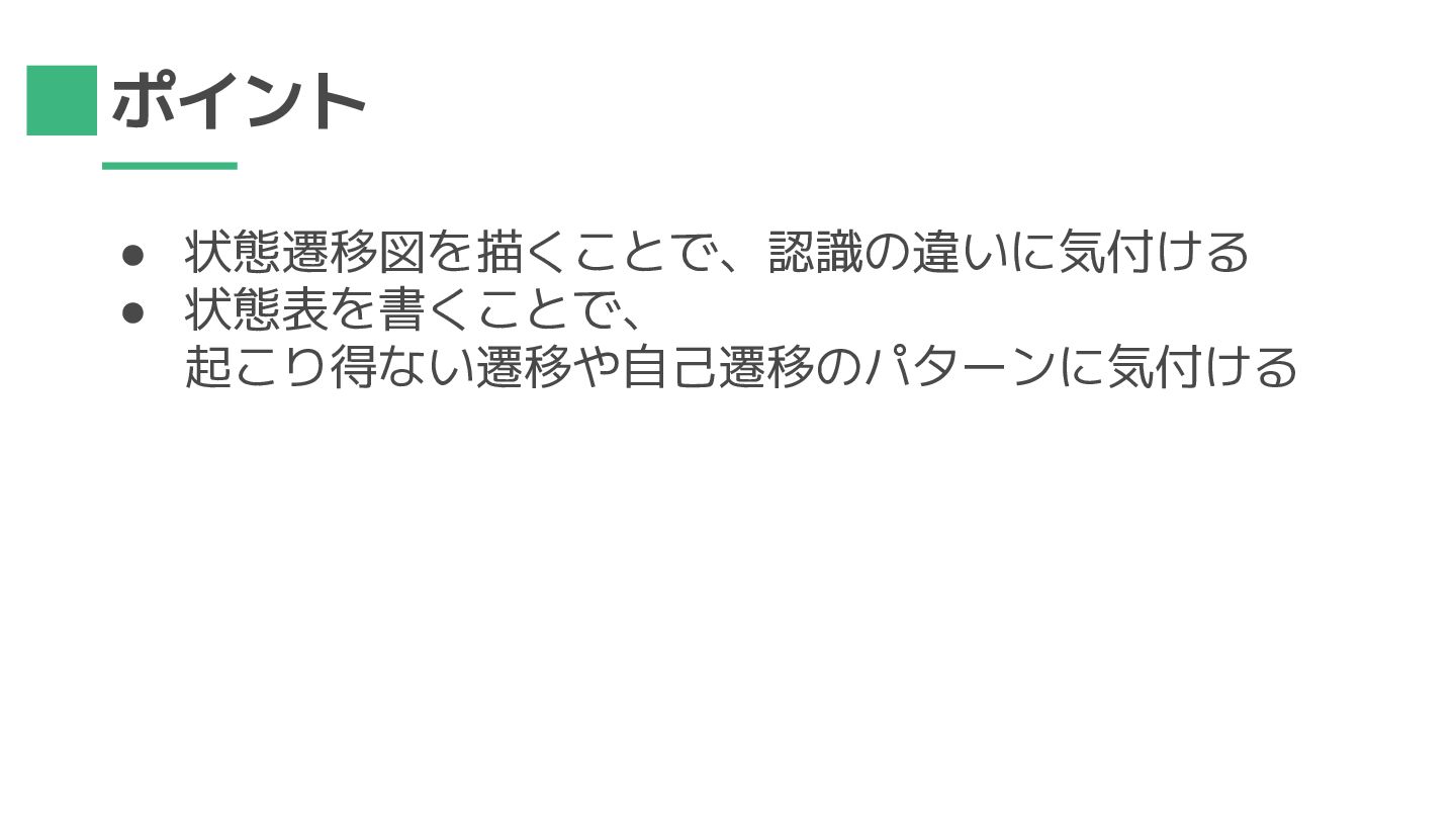 ポイント • 状態遷移図を描くことで、認識の違いに気付ける • 状態表を書くことで、 起こり得ない遷移や自己遷移のパターンに気付ける