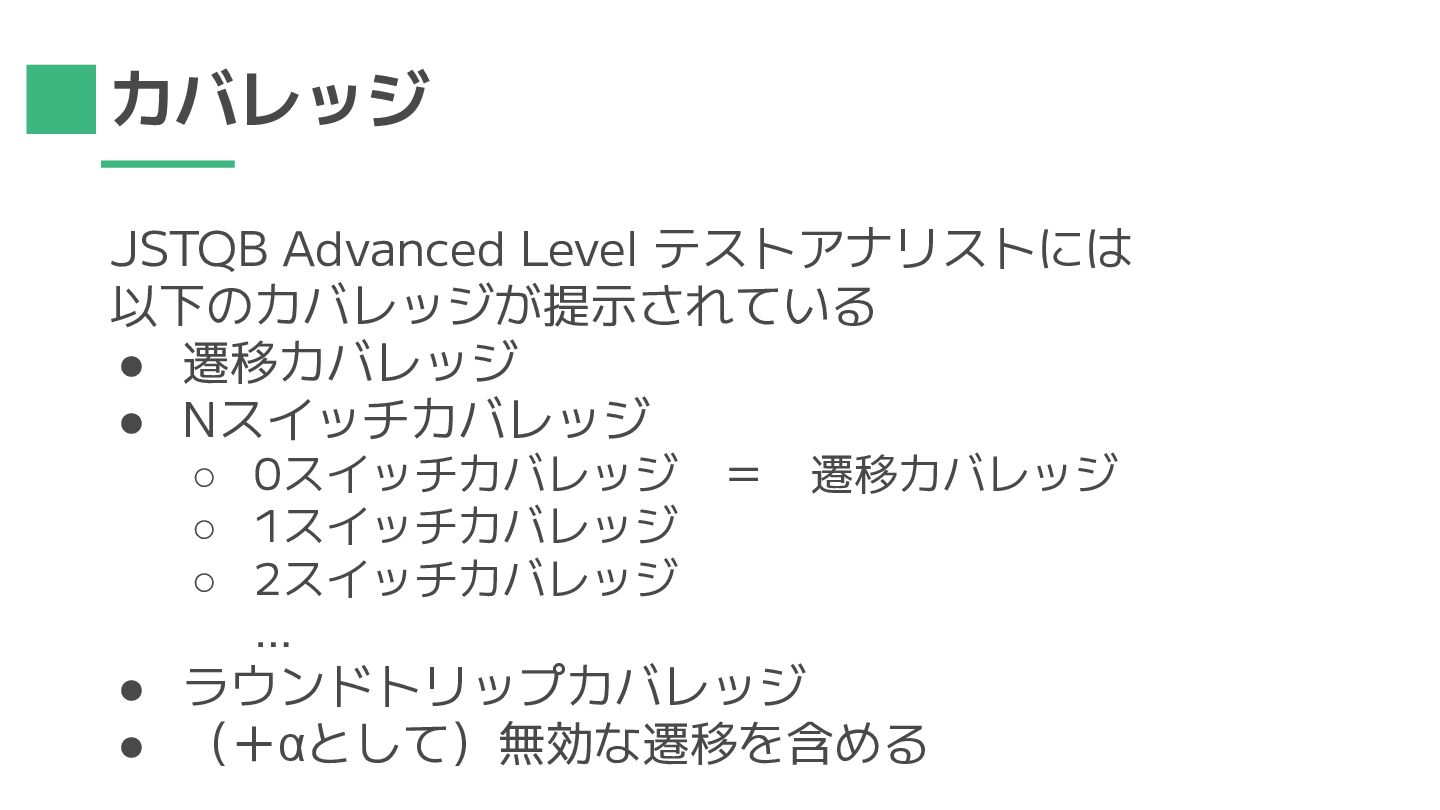 カバレッジ JSTQB Advanced Level テストアナリストには 以下のカバレッジが提示されている • 遷移カバレッジ • Nスイッチカバレッジ