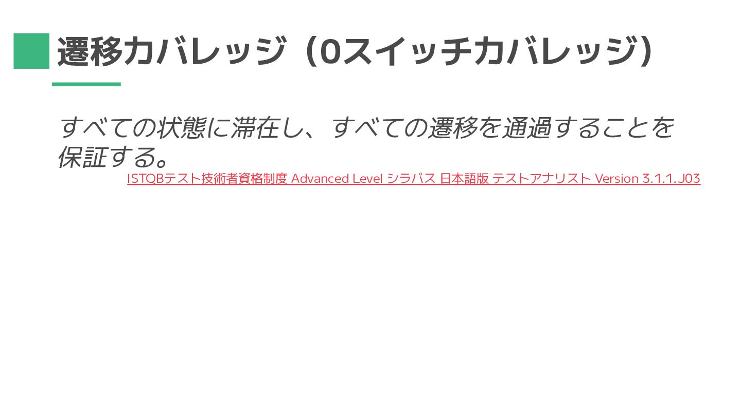 遷移カバレッジ(0スイッチカバレッジ) すべての状態に滞在し、すべての遷移を通過することを 保証する。 ISTQBテスト技術者資格制度 Advanced Level シラバス 日本語版 テストアナリスト Version