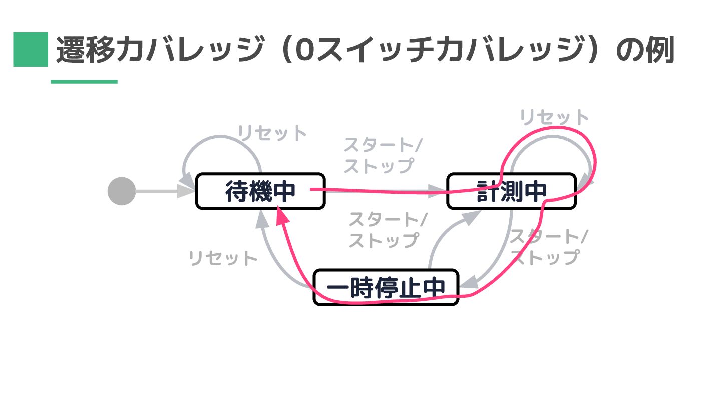遷移カバレッジ(0スイッチカバレッジ)の例 リセット スタート/ ストップ スタート/ ストップ スタート/ ストップ リセット リセット