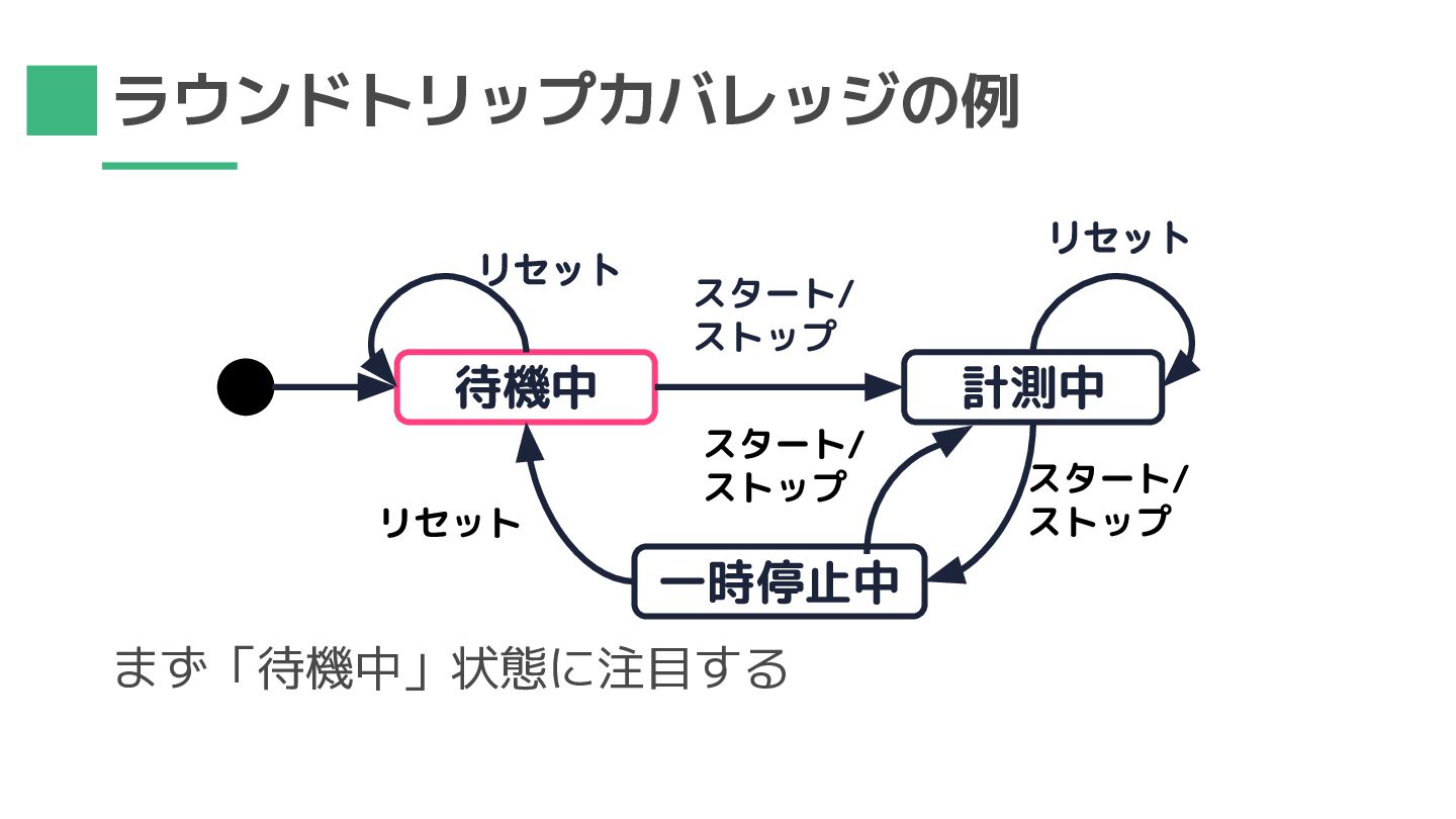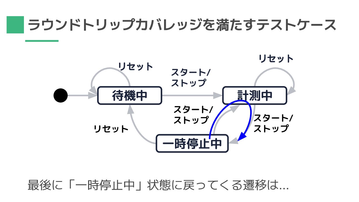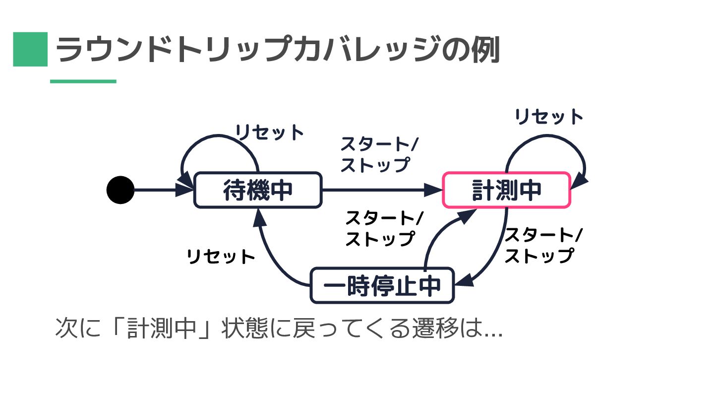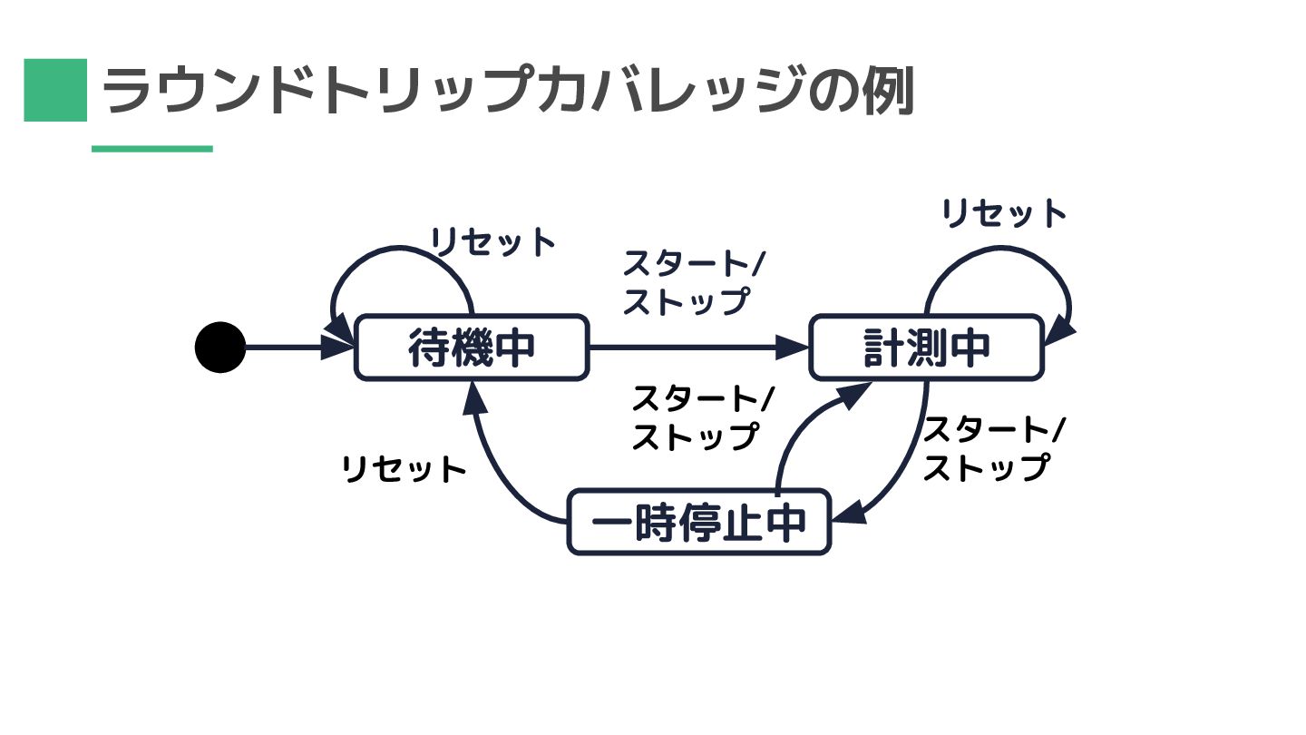 待機中 計測中 一時停止中 上記2ケースを実行することで、 遷移カバレッジが100%になる