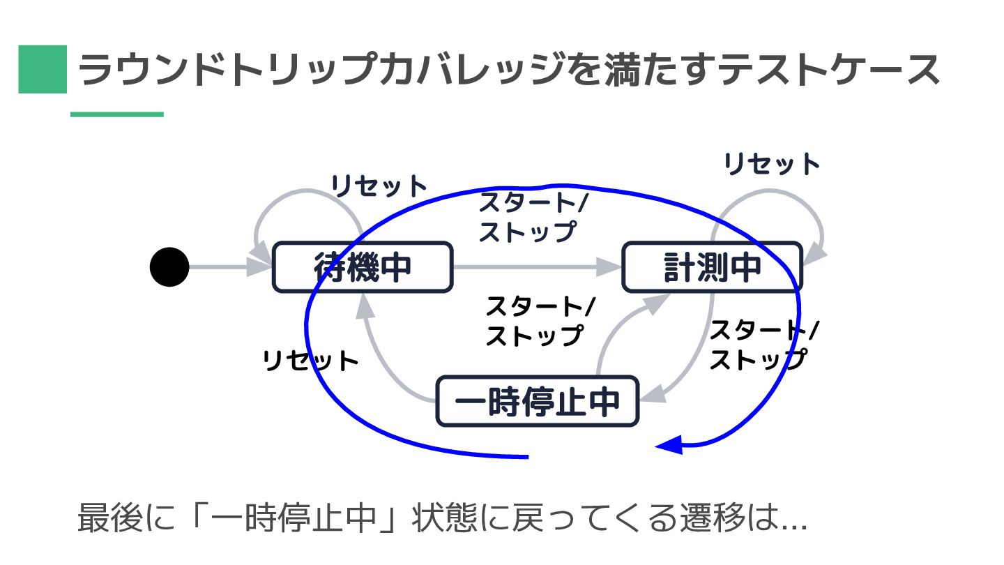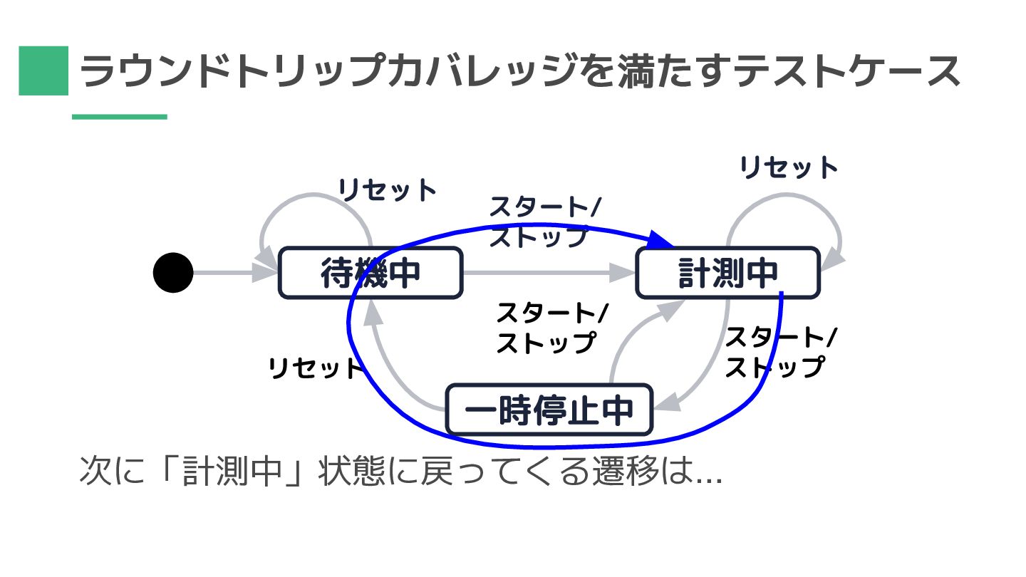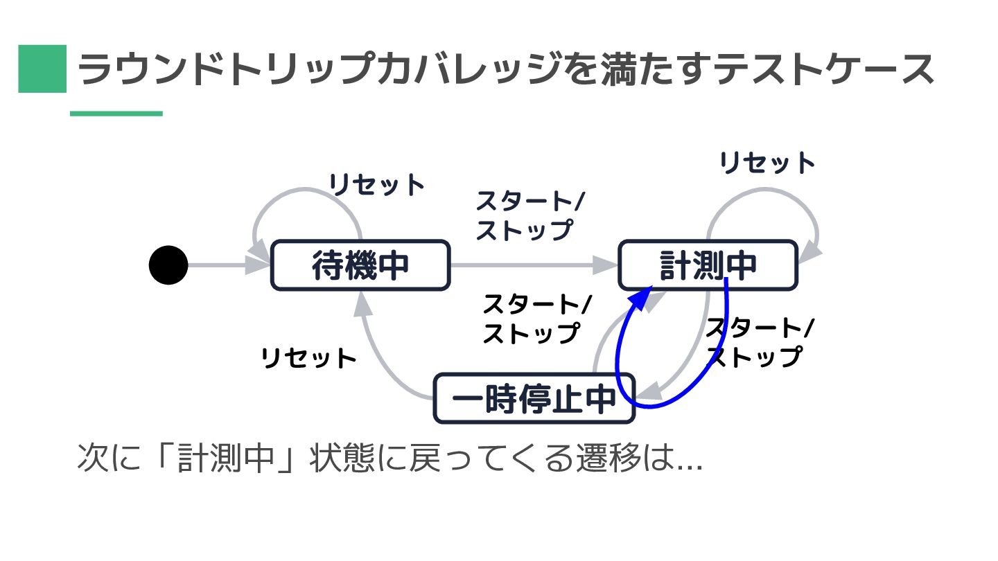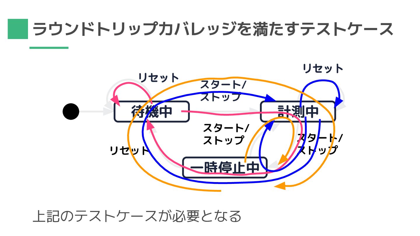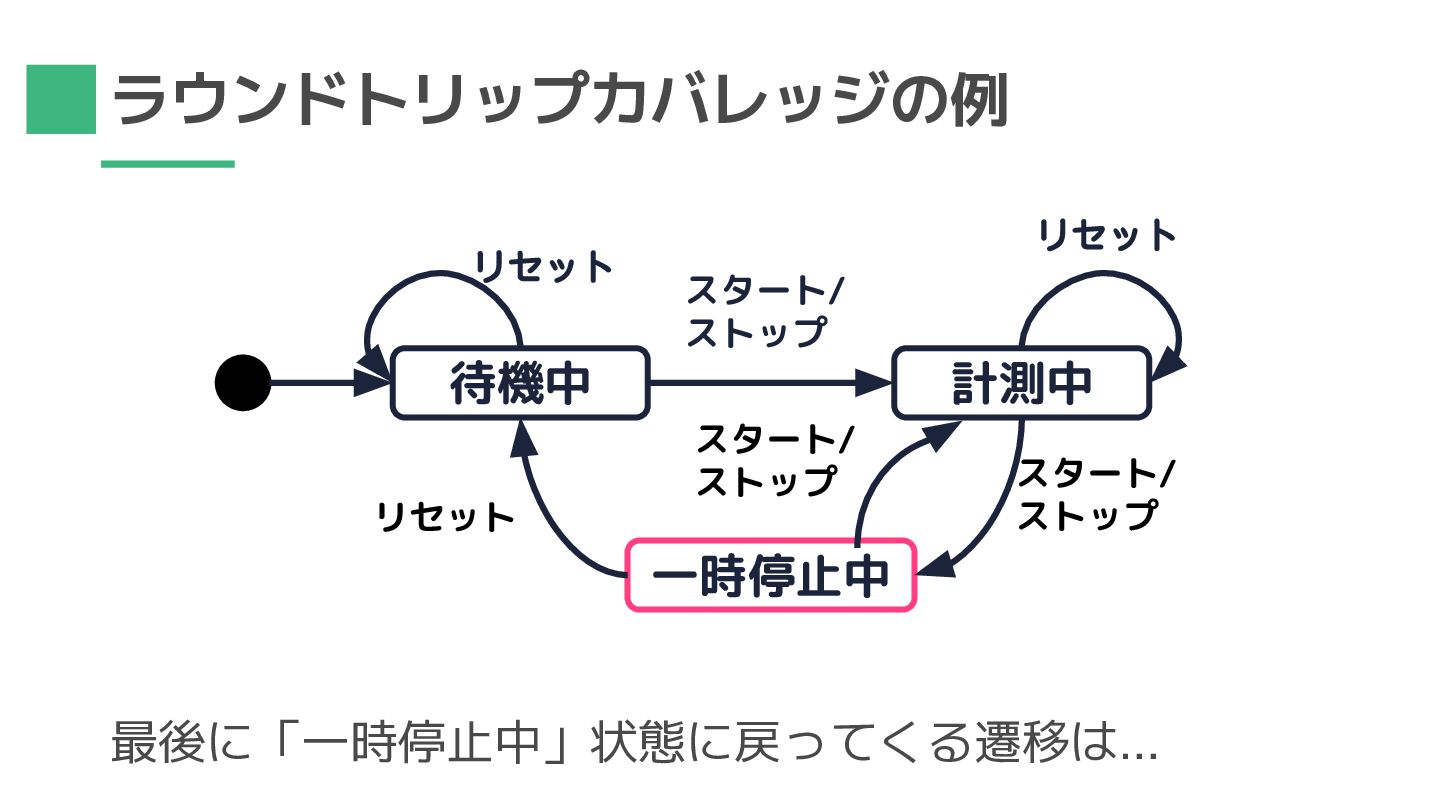 待機中 計測中 一時停止中 上記2ケースを実行することで、 遷移カバレッジが100%になる