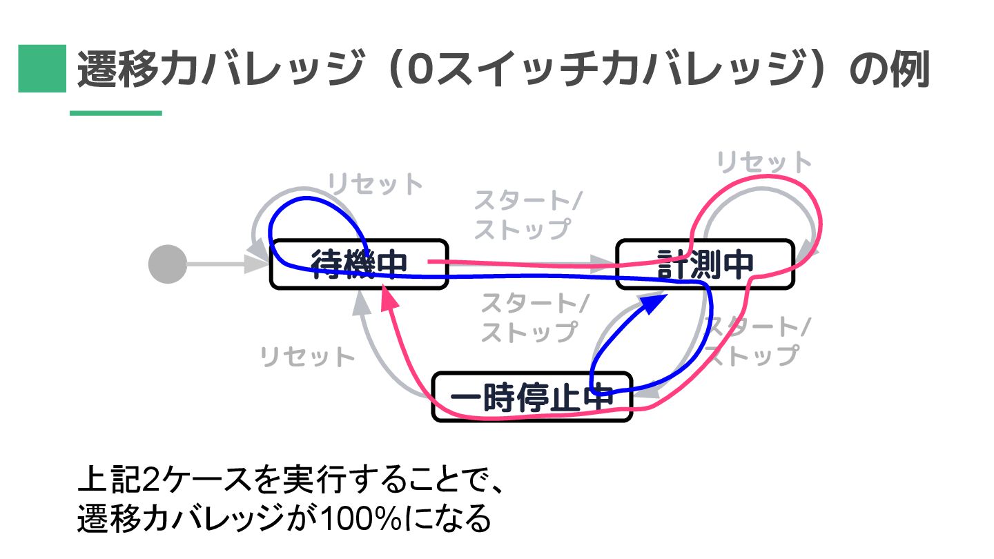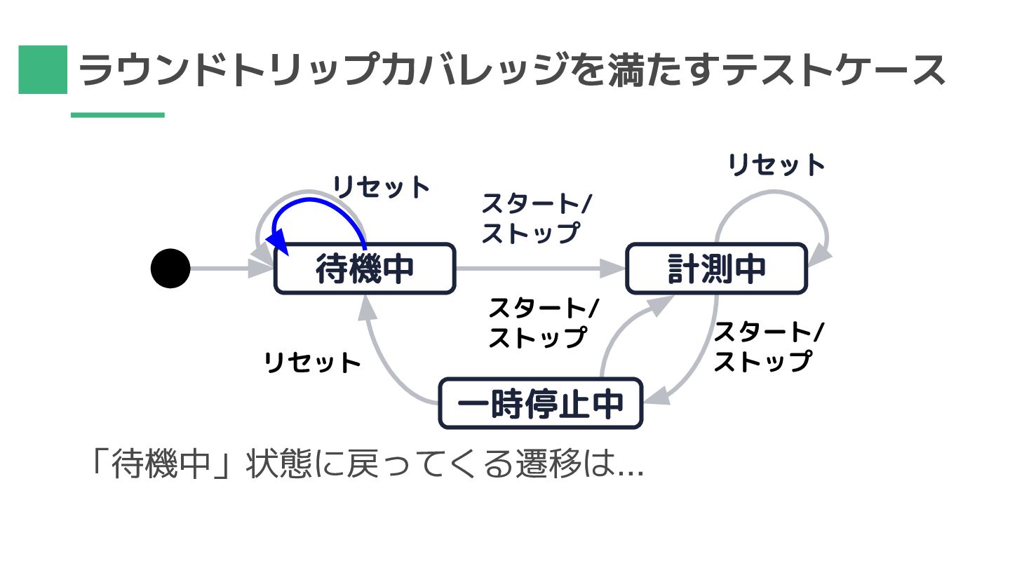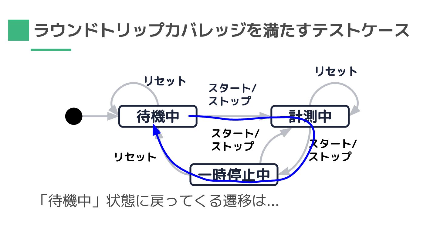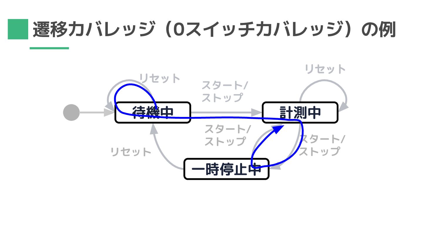 待機中 計測中 一時停止中 上記2ケースを実行することで、 遷移カバレッジが100%になる