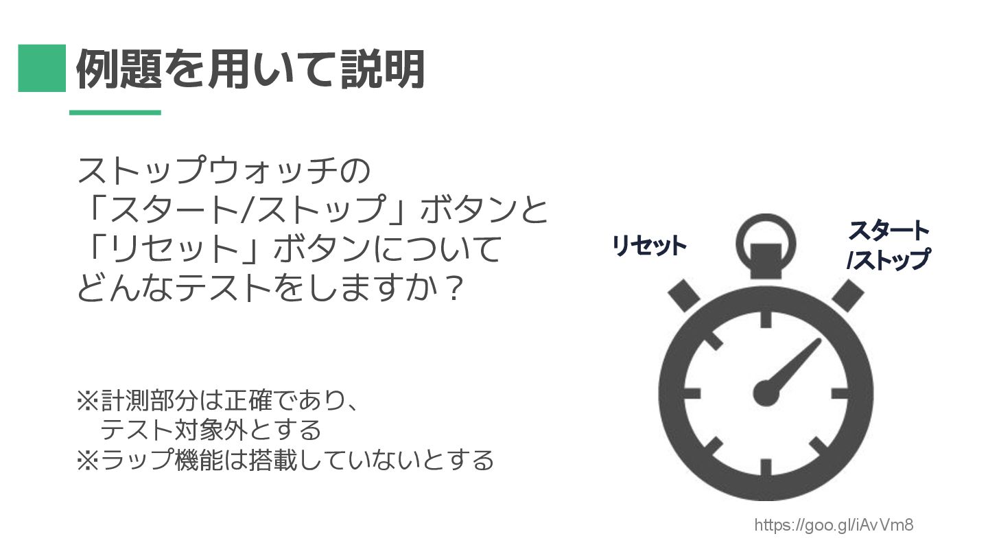 例題を用いて説明 ストップウォッチの 「スタート/ストップ」ボタンと 「リセット」ボタンについて どんなテストをしますか? ※計測部分は正確であり、 テスト対象外とする ※ラップ機能は搭載していないとする スタート /ストップ