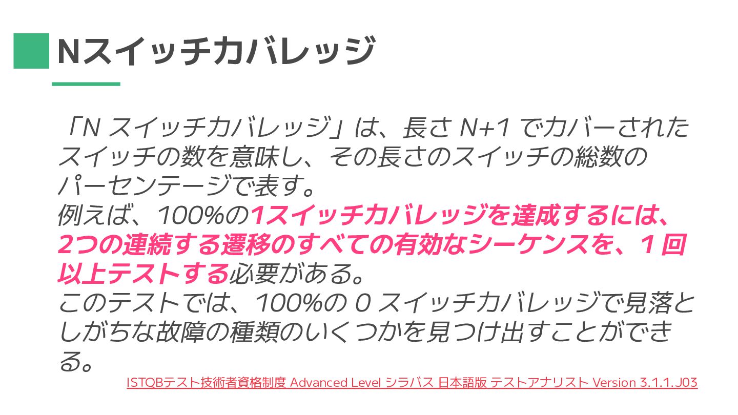 以上テストする必要がある。 このテストでは、100%の 0 スイッチカバレッジで見落と しがちな故障の種類のいくつかを見つけ出すことができ る。 ISTQBテスト技術者資格制度 Advanced Level シラバス 日本語版 テストアナリスト Version 3.1.1.J03