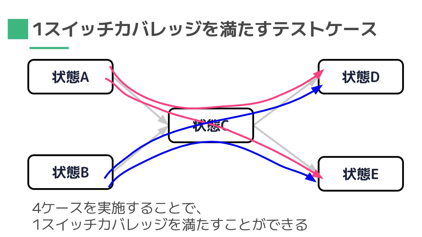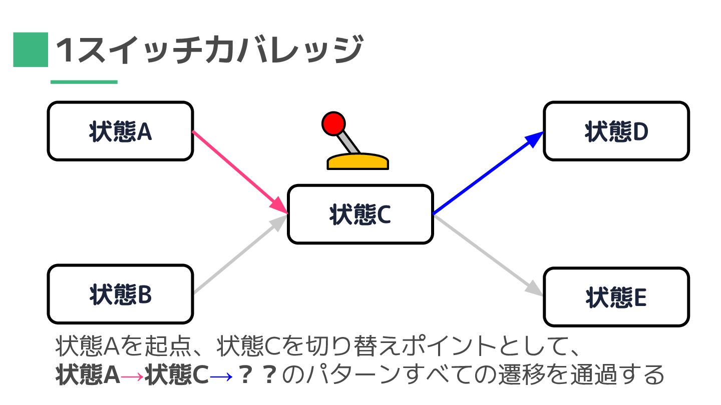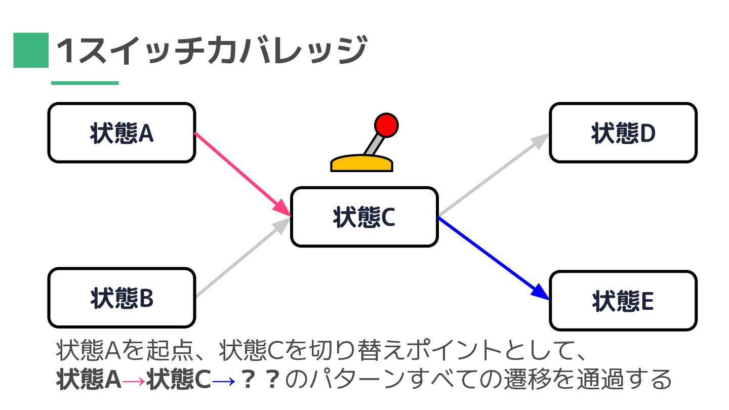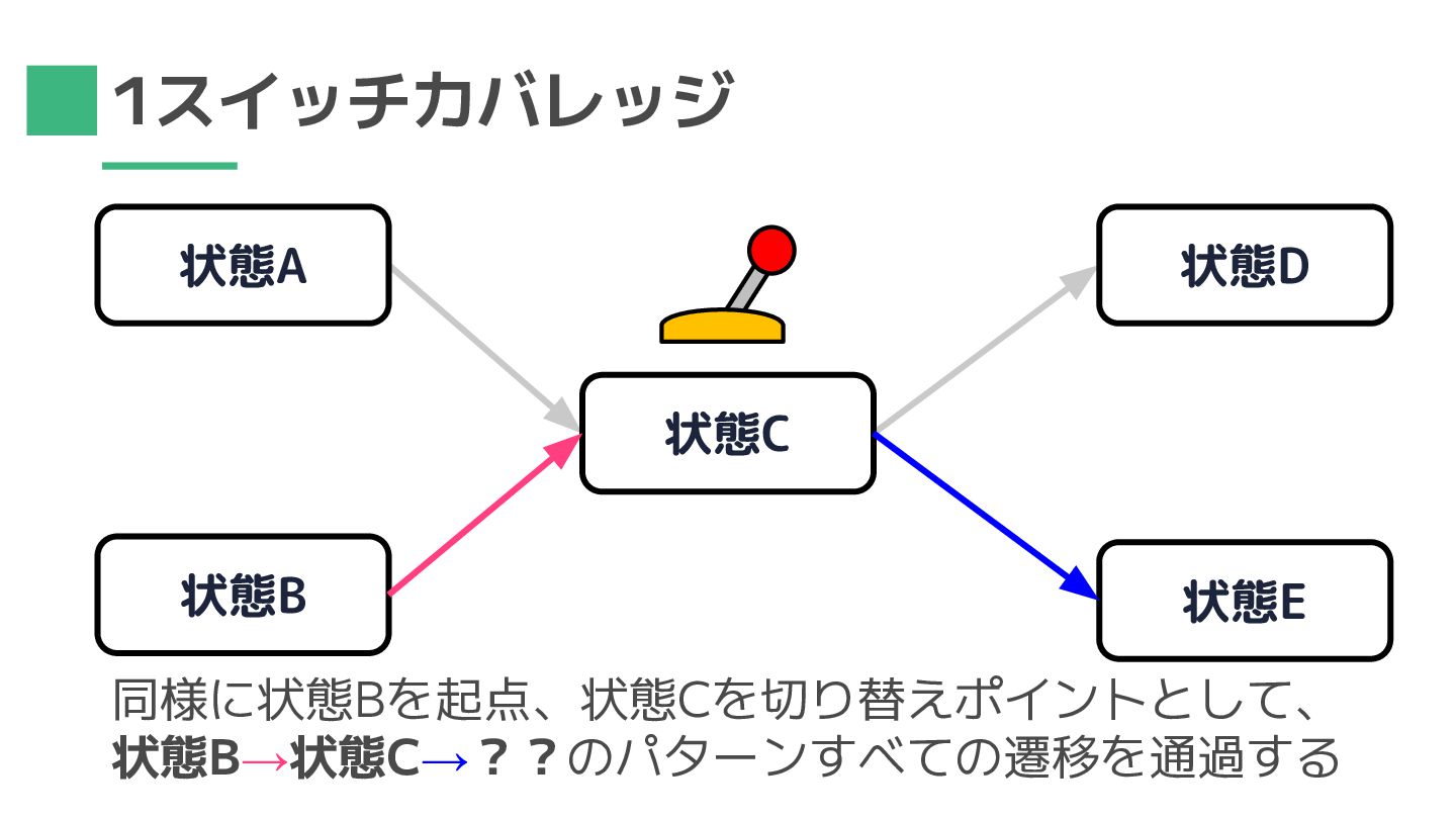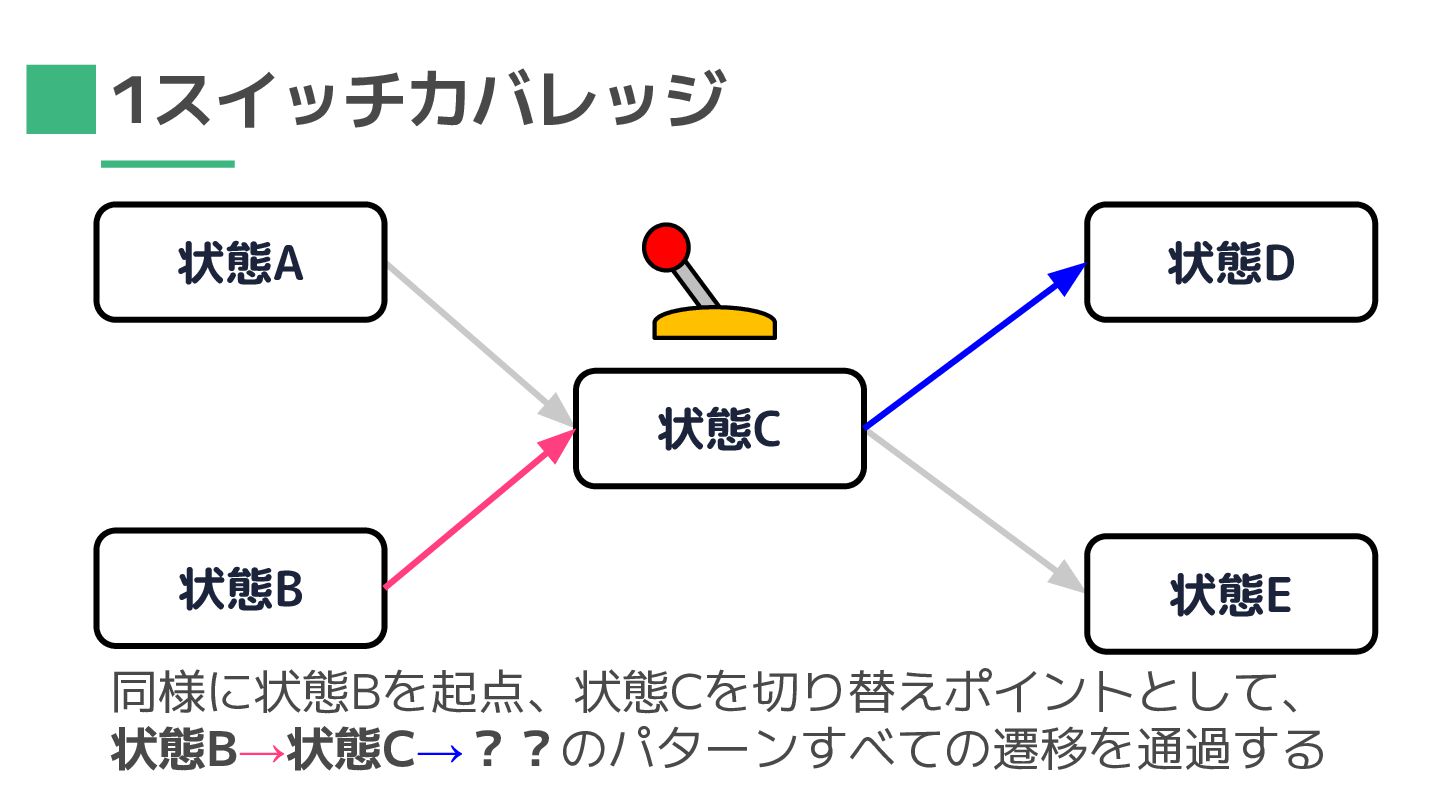 1スイッチカバレッジ 状態C 状態A 状態B 状態D 状態E 状態Aを起点、状態Cを切り替えポイントとして、 状態A→状態C→??のパターンすべての遷移を通過する