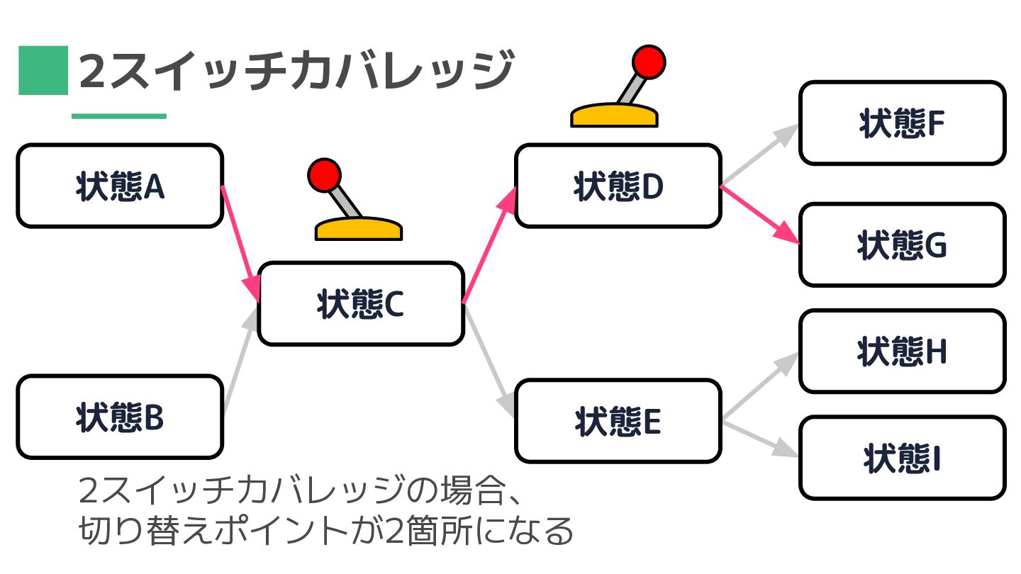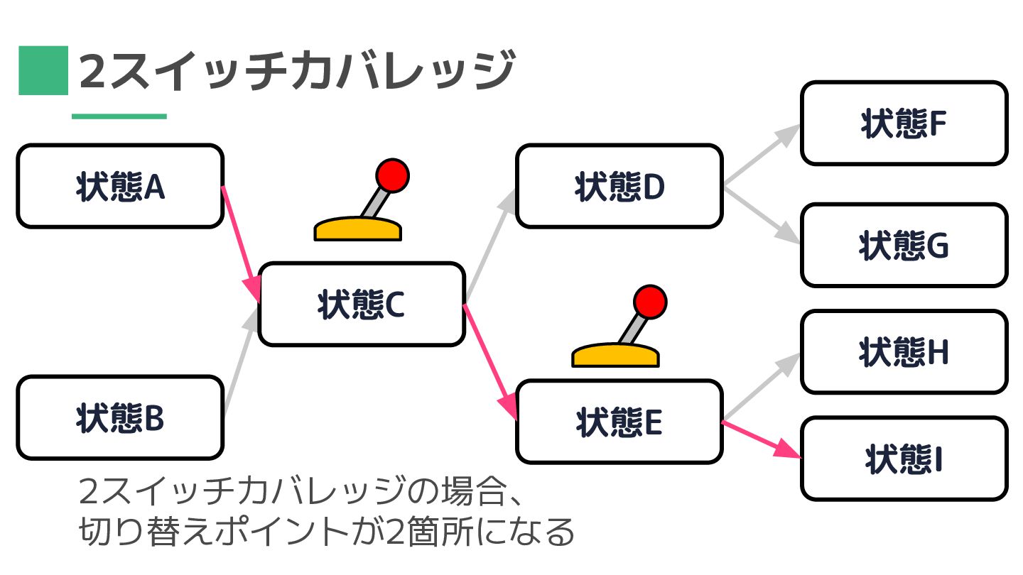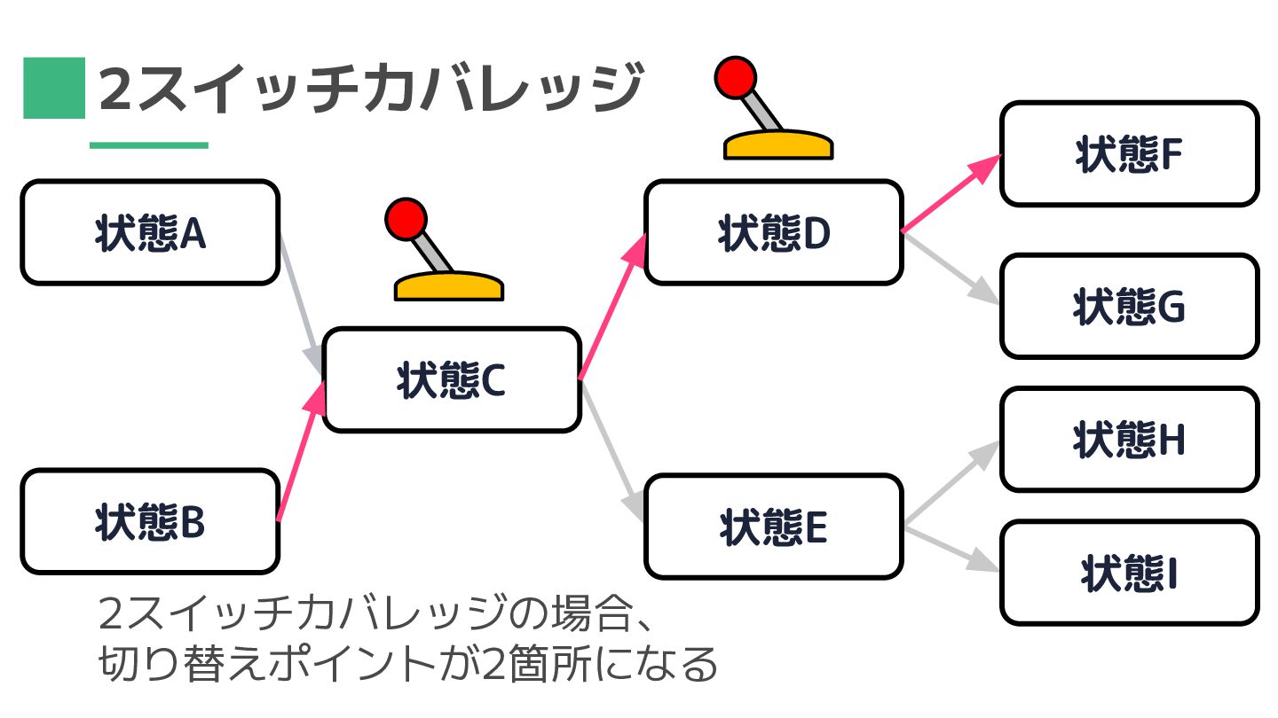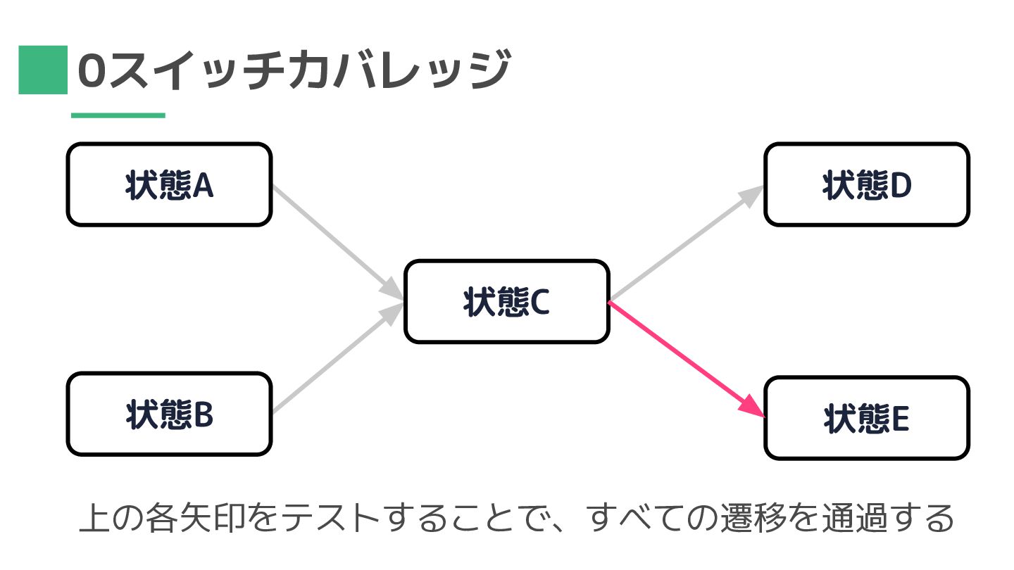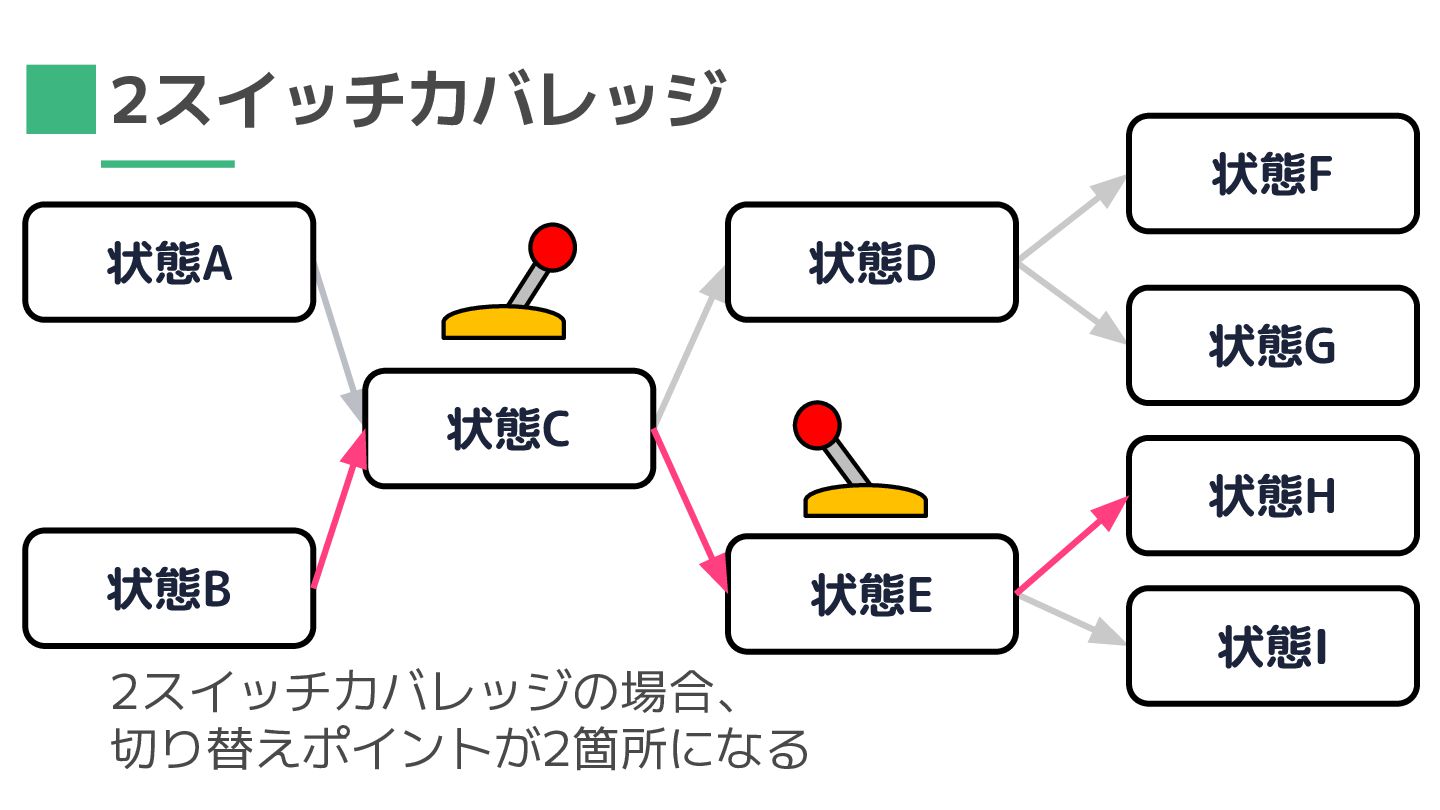 1スイッチカバレッジ 状態C 状態A 状態B 状態D 状態E 状態Aを起点、状態Cを切り替えポイントとして、 状態A→状態C→??のパターンすべての遷移を通過する