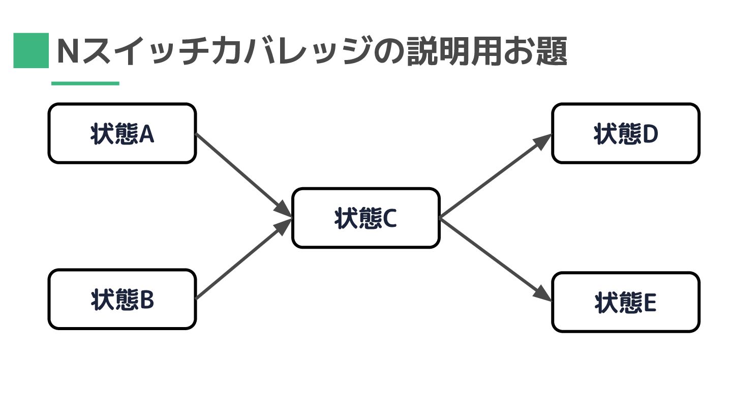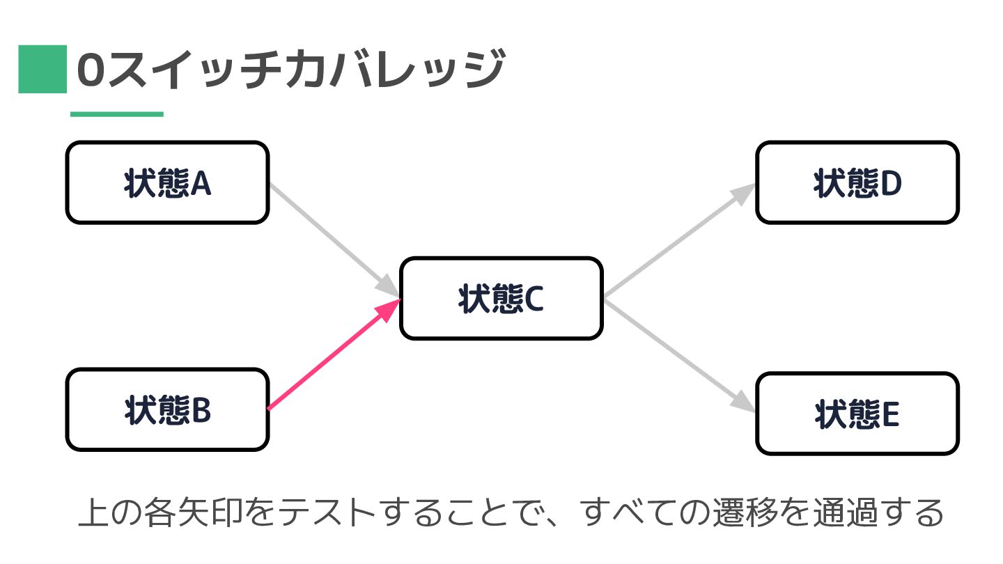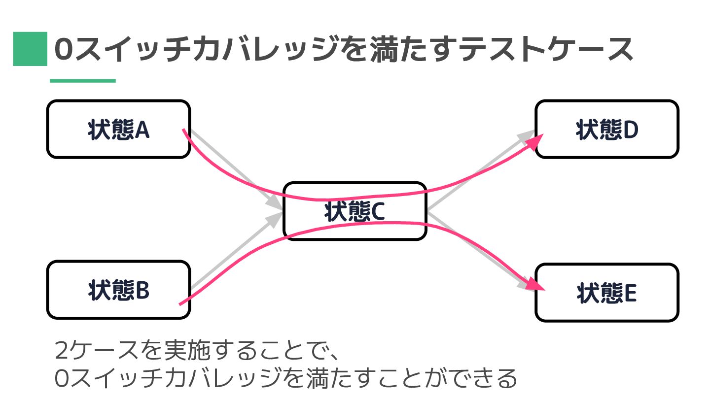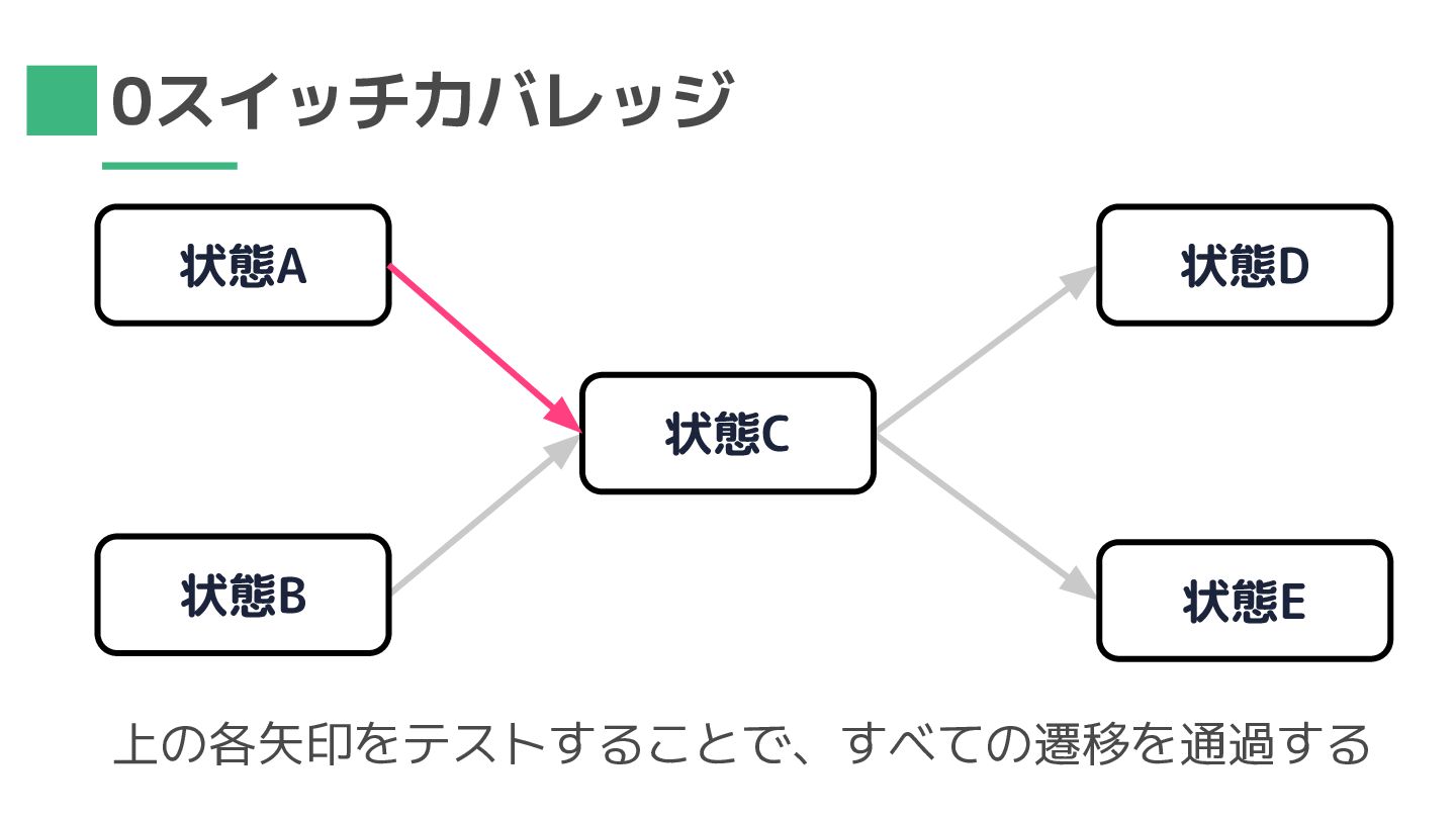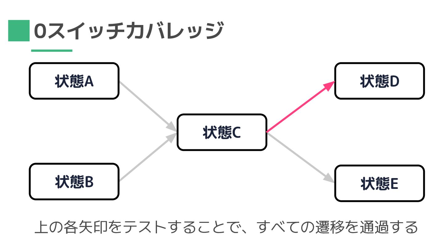 1スイッチカバレッジ 状態C 状態A 状態B 状態D 状態E 状態Aを起点、状態Cを切り替えポイントとして、 状態A→状態C→??のパターンすべての遷移を通過する