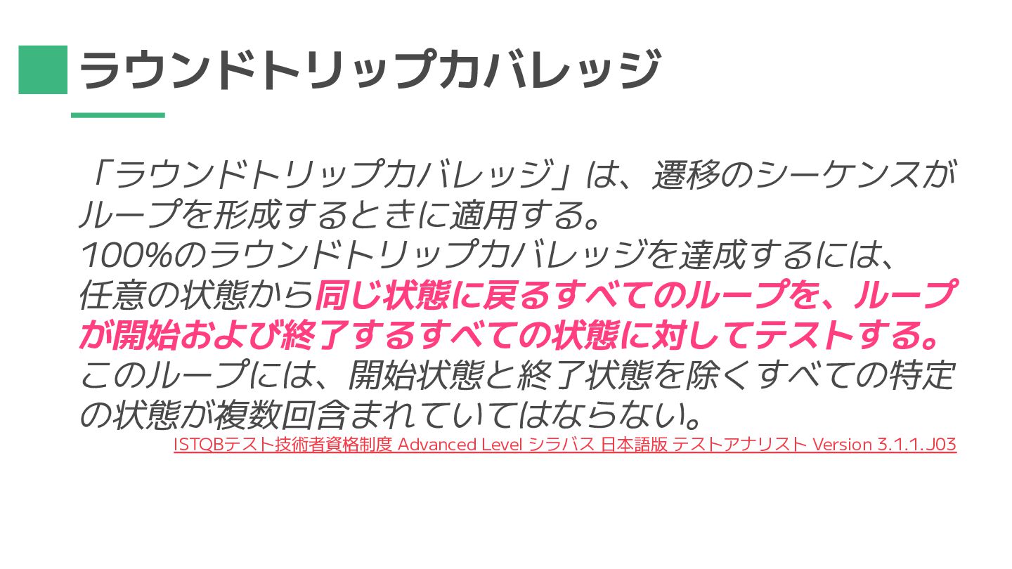 ラウンドトリップカバレッジ 「ラウンドトリップカバレッジ」は、遷移のシーケンスが ループを形成するときに適用する。 100%のラウンドトリップカバレッジを達成するには、 任意の状態から同じ状態に戻るすべてのループを、ループ が開始および終了するすべての状態に対してテストする。 このループには、開始状態と終了状態を除くすべての特定 の状態が複数回含まれていてはならない。 ISTQBテスト技術者資格制度 Advanced
