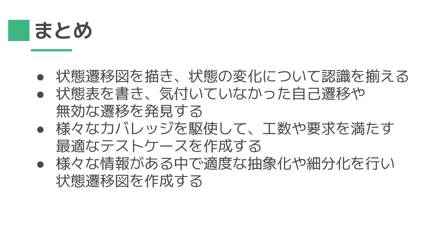 まとめ • 状態遷移図を描き、状態の変化について認識を揃える • 状態表を書き、気付いていなかった自己遷移や 無効な遷移を発見する • 様々なカバレッジを駆使して、工数や要求を満たす 最適なテストケースを作成する •