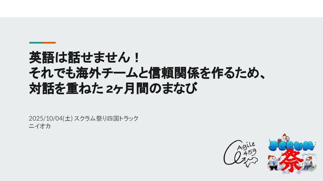 英語は話せません! それでも海外チームと信頼関係を作るため、 対話を重ねた 2ヶ月間のまなび 2025/10/04(土) スクラム祭り四国トラック ニイオカ