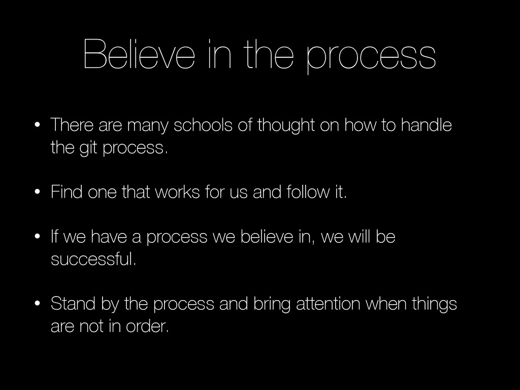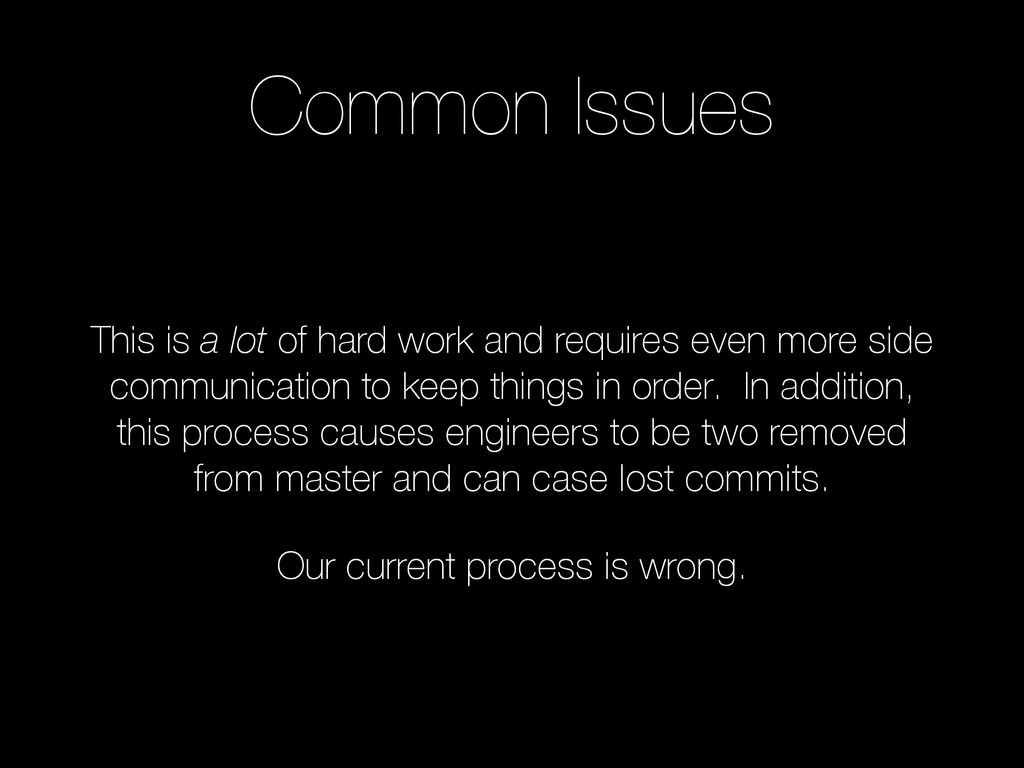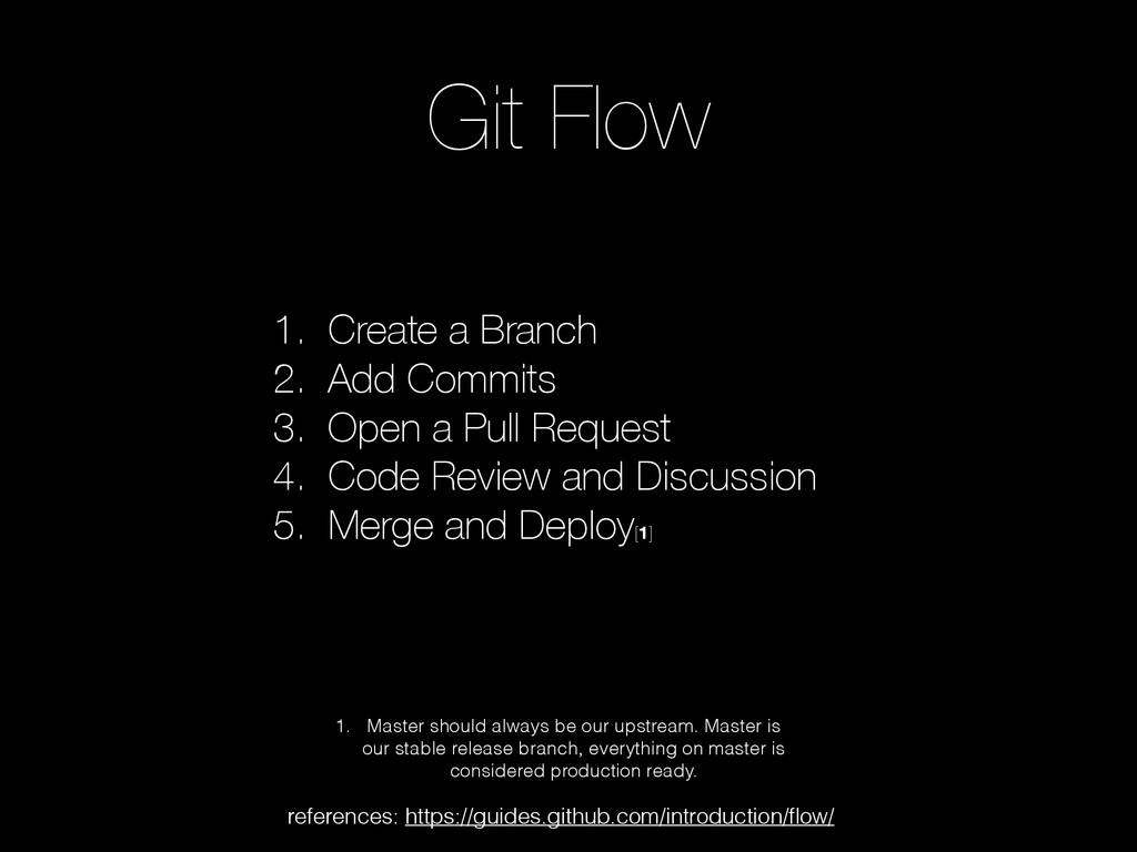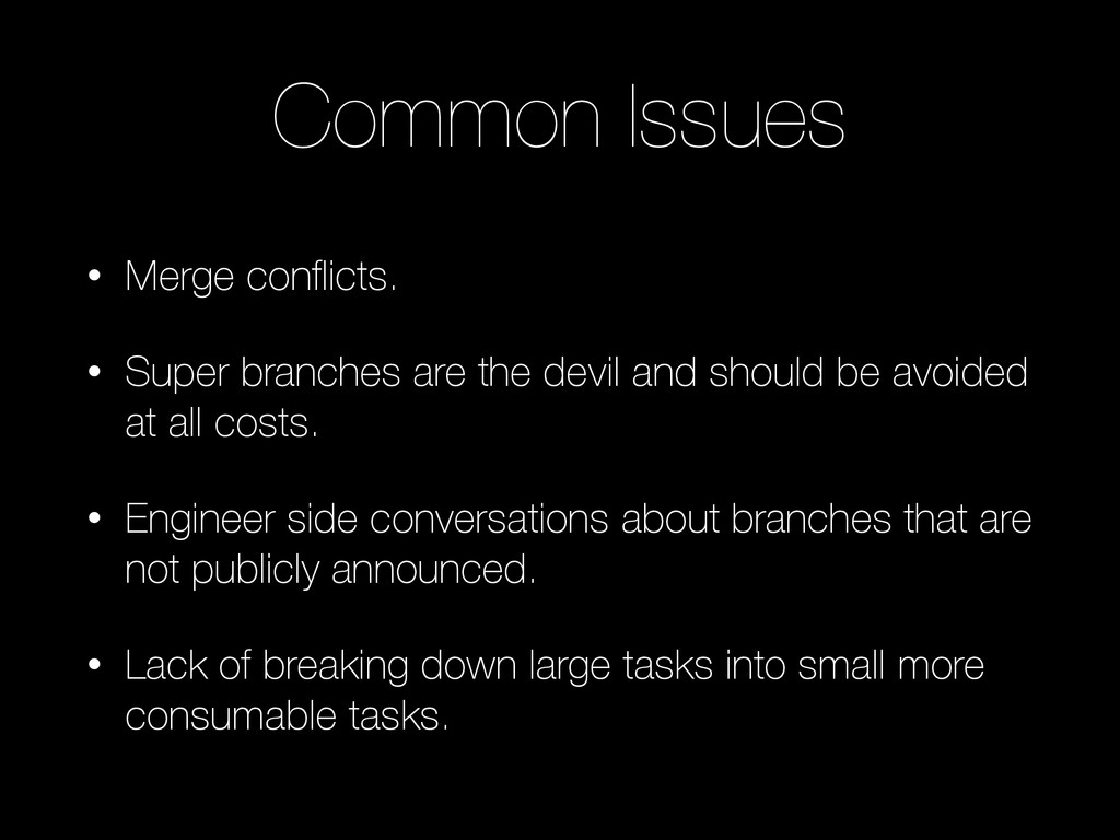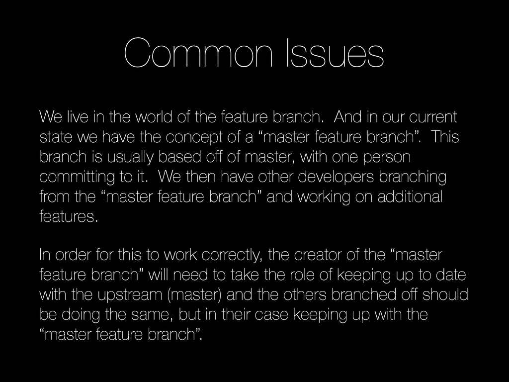 branch. And in our current state we have the concept of a “master feature branch”. This branch is usually based off of master, with one person committing to it. We then have other developers branching from the “master feature branch” and working on additional features. In order for this to work correctly, the creator of the “master feature branch” will need to take the role of keeping up to date with the upstream (master) and the others branched off should be doing the same, but in their case keeping up with the “master feature branch”.