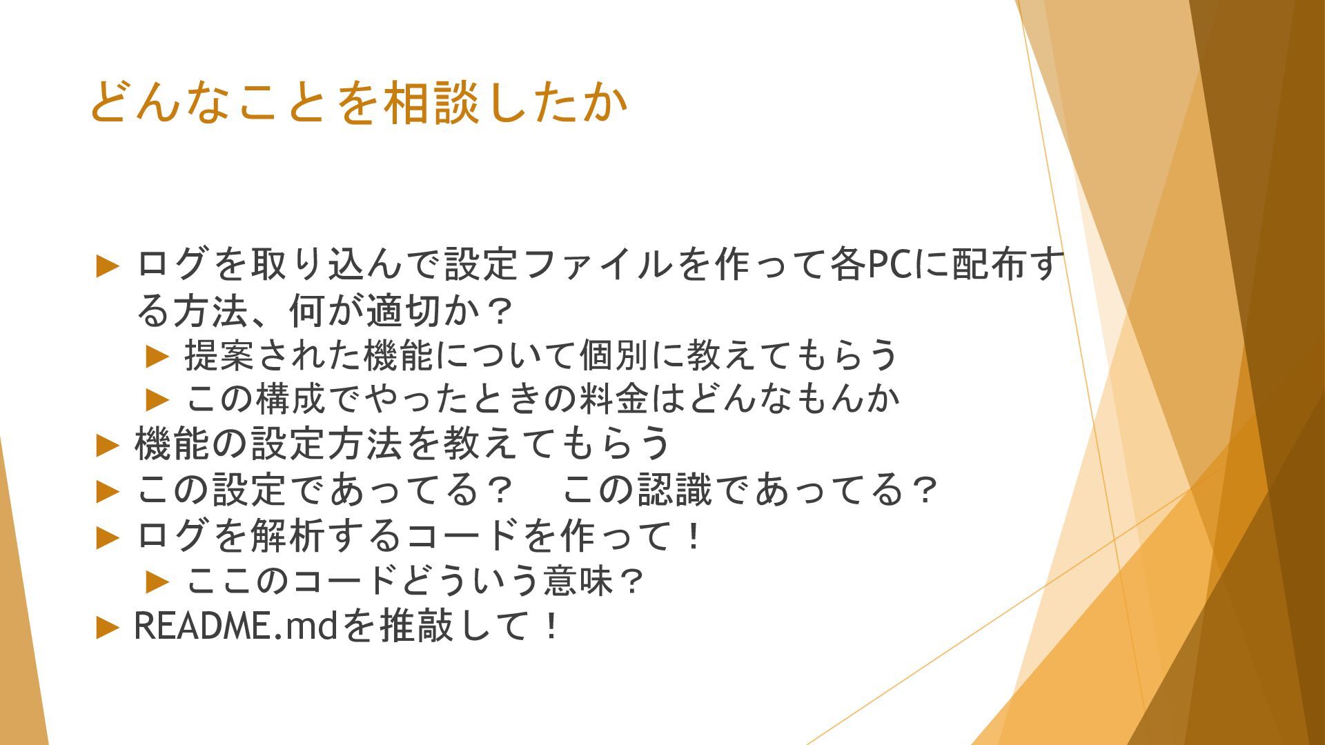 どんなことを相談したか ► ログを取り込んで設定ファイルを作って各PCに配布す る方法、何が適切か? ► 提案された機能について個別に教えてもらう ► この構成でやったときの料金はどんなもんか ► 機能の設定方法を教えてもらう
