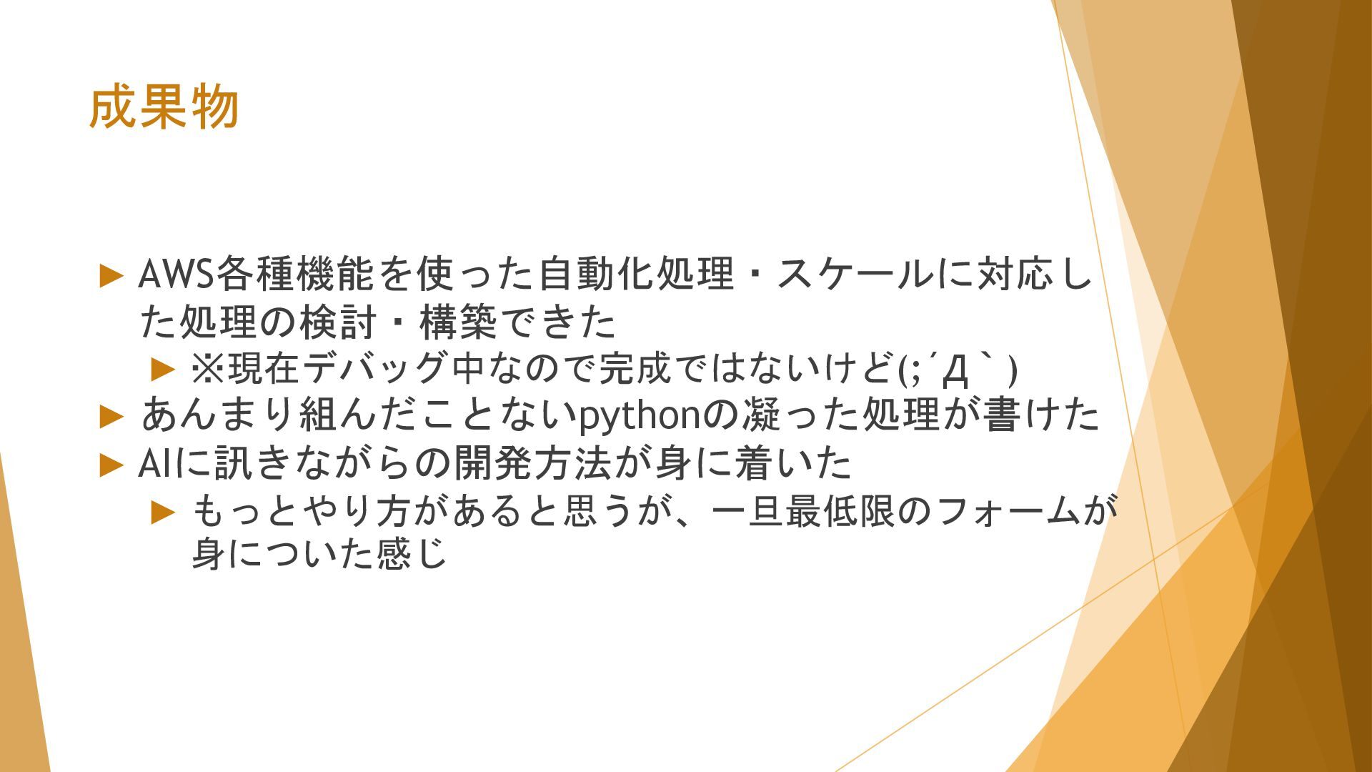 成果物 ► AWS各種機能を使った自動化処理・スケールに対応し た処理の検討・構築できた ► ※現在デバッグ中なので完成ではないけど(;´Д`) ► あんまり組んだことないpythonの凝った処理が書けた ► AIに訊きながらの開発方法が身に着いた
