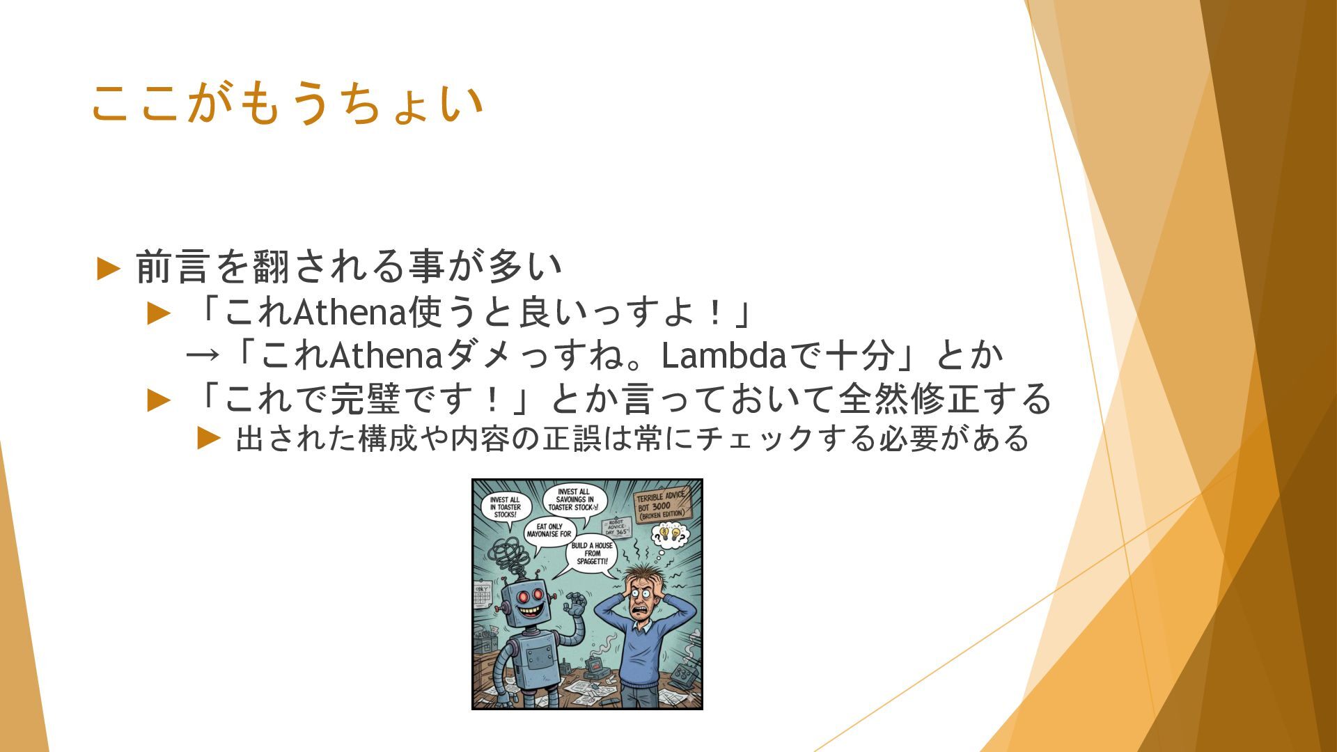 ここがもうちょい ► 前言を翻される事が多い ► 「これAthena使うと良いっすよ!」 →「これAthenaダメっすね。Lambdaで十分」とか ► 「これで完璧です!」とか言っておいて全然修正する ► 出された構成や内容の正誤は常にチェックする必要がある