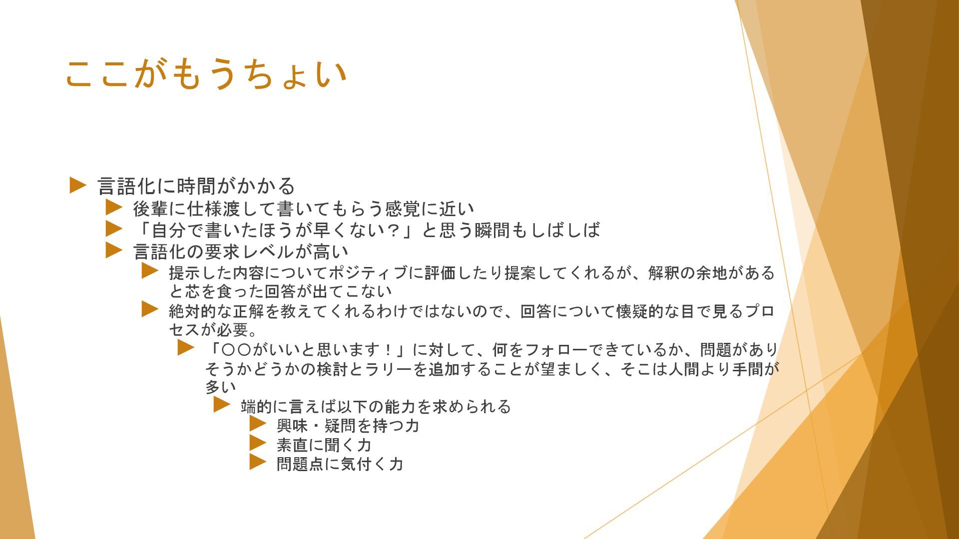 ここがもうちょい ► 言語化に時間がかかる ► 後輩に仕様渡して書いてもらう感覚に近い ► 「自分で書いたほうが早くない?」と思う瞬間もしばしば ► 言語化の要求レベルが高い ►