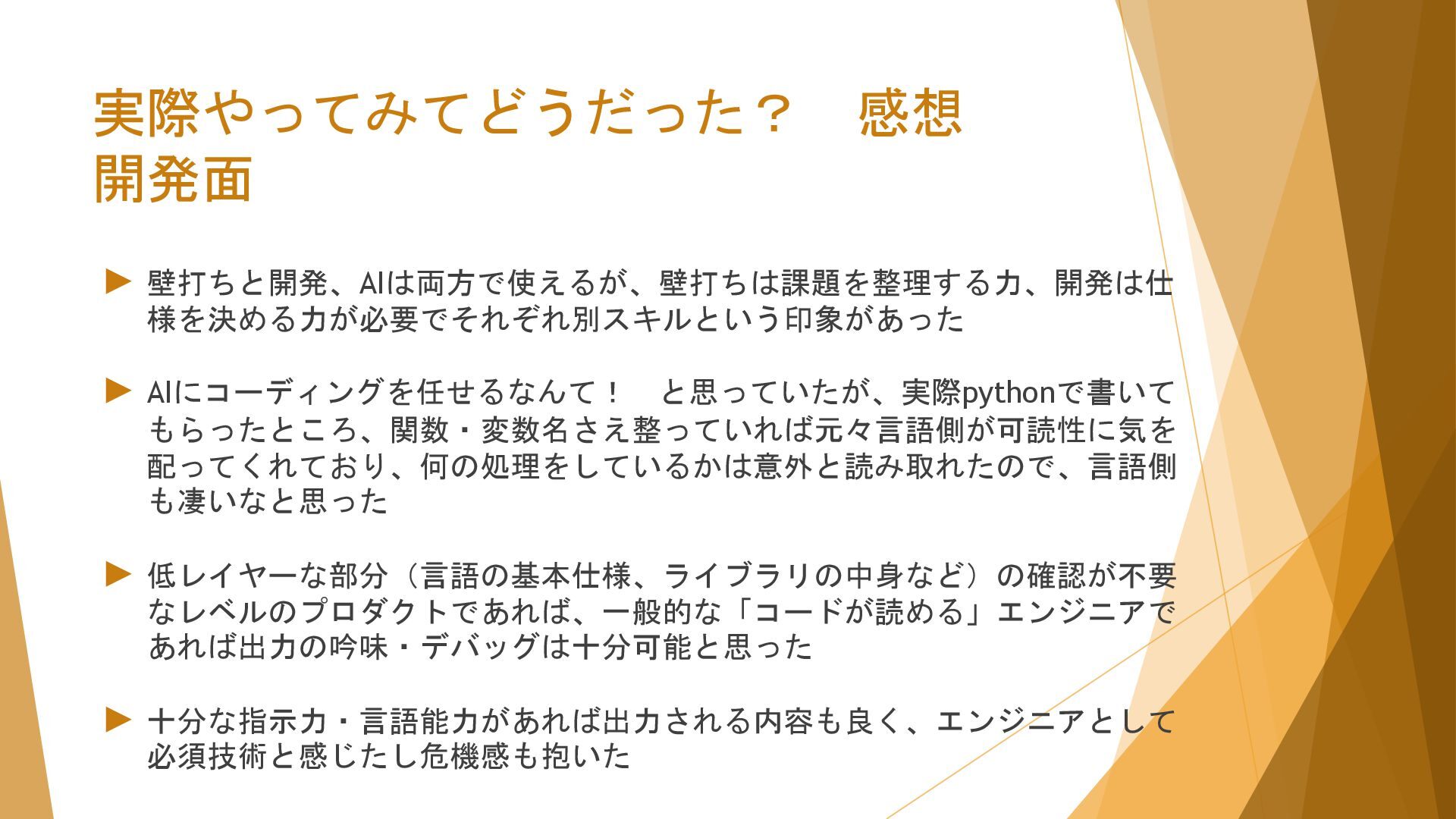 配ってくれており、何の処理をしているかは意外と読み取れたので、言語側 も凄いなと思った ► 低レイヤーな部分(言語の基本仕様、ライブラリの中身など)の確認が不要 なレベルのプロダクトであれば、一般的な「コードが読める」エンジニアで あれば出力の吟味・デバッグは十分可能と思った ► 十分な指示力・言語能力があれば出力される内容も良く、エンジニアとして 必須技術と感じたし危機感も抱いた