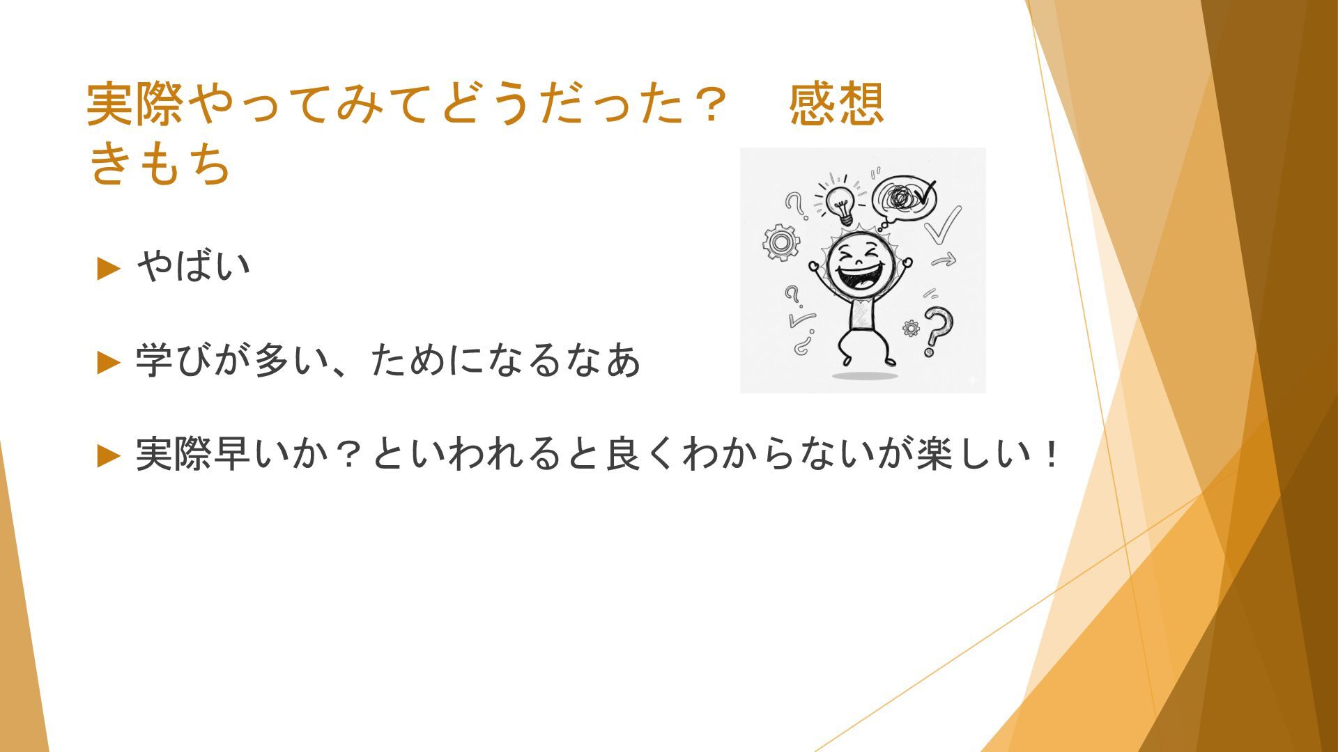 実際やってみてどうだった? 感想 きもち ► やばい ► 学びが多い、ためになるなあ ► 実際早いか?といわれると良くわからないが楽しい!