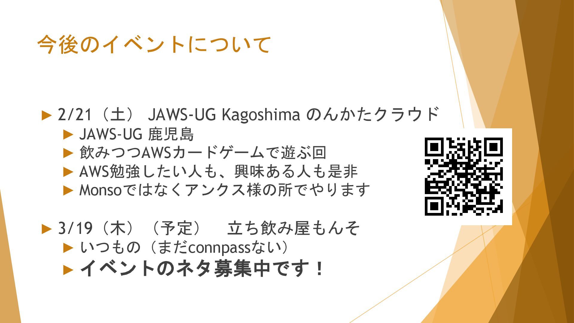 今後のイベントについて ► 2/21(土) JAWS-UG Kagoshima のんかたクラウド ► JAWS-UG 鹿児島 ►