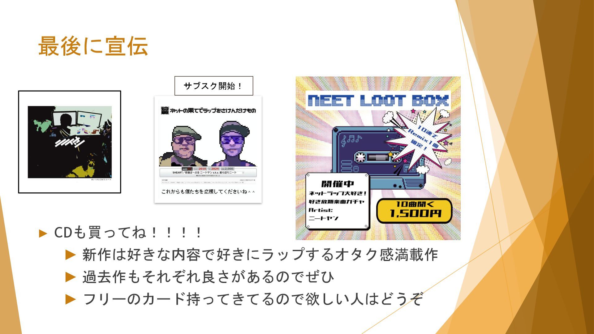 最後に宣伝 ► CDも買ってね!!!! ► 新作は好きな内容で好きにラップするオタク感満載作 ► 過去作もそれぞれ良さがあるのでぜひ ► フリーのカード持ってきてるので欲しい人はどうぞ サブスク開始!