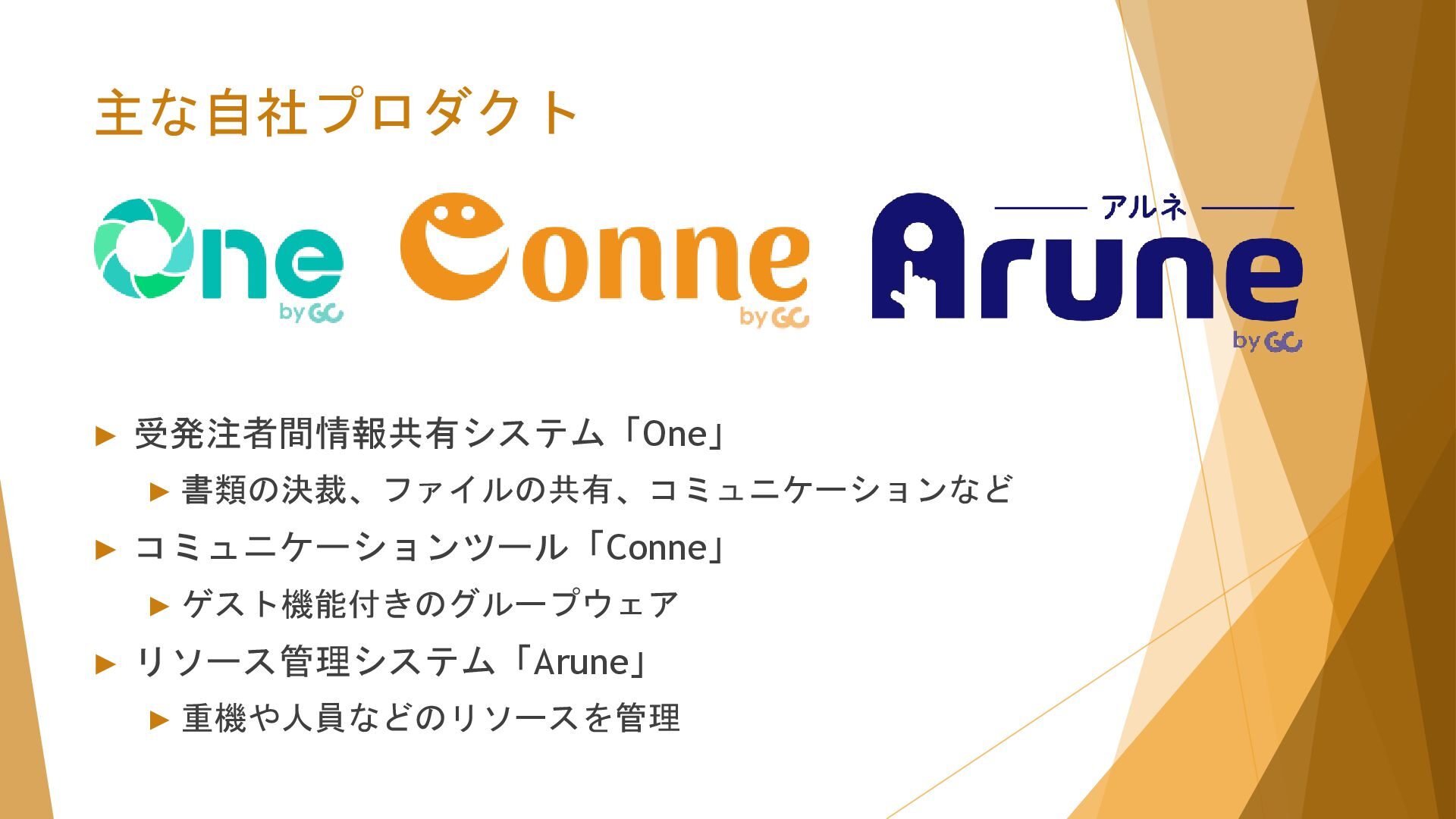 主な自社プロダクト ► 受発注者間情報共有システム「One」 ► 書類の決裁、ファイルの共有、コミュニケーションなど ► コミュニケーションツール「Conne」 ► ゲスト機能付きのグループウェア ►
