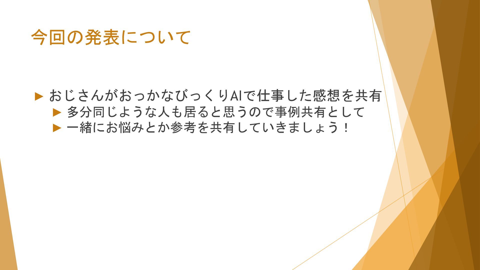 今回の発表について ► おじさんがおっかなびっくりAIで仕事した感想を共有 ► 多分同じような人も居ると思うので事例共有として ► 一緒にお悩みとか参考を共有していきましょう!