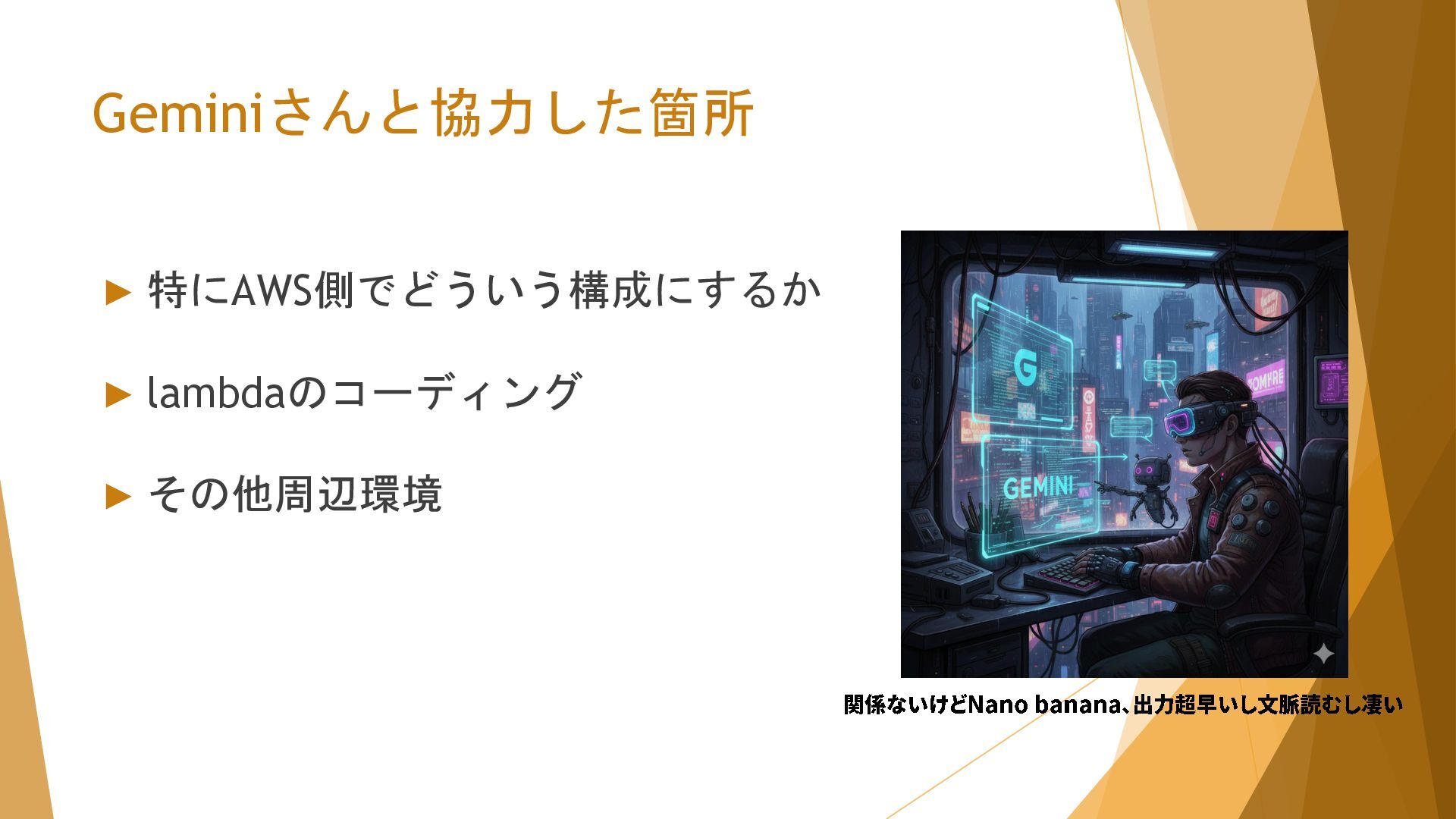 Geminiさんと協力した箇所 ► 特にAWS側でどういう構成にするか ► lambdaのコーディング ► その他周辺環境