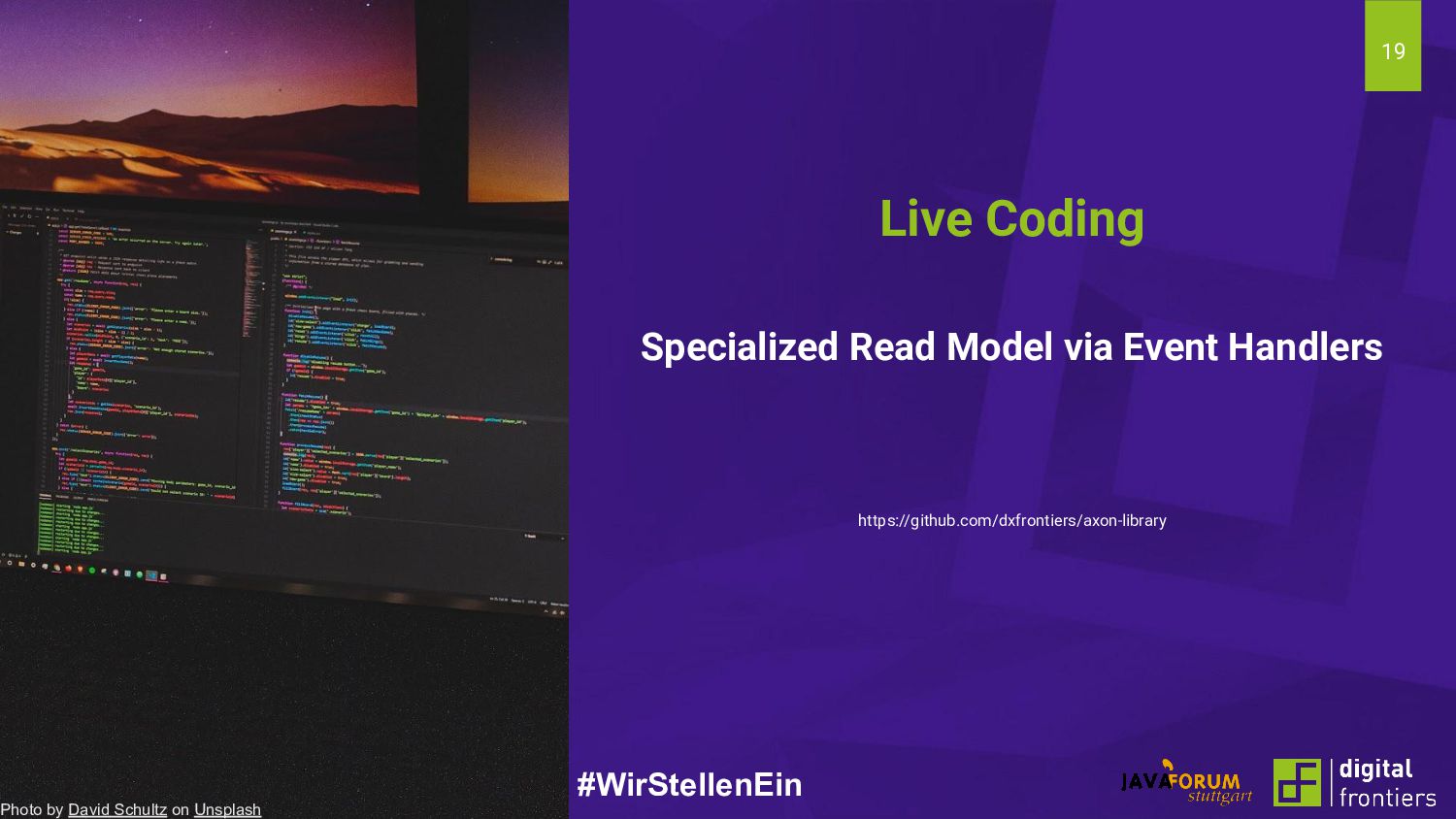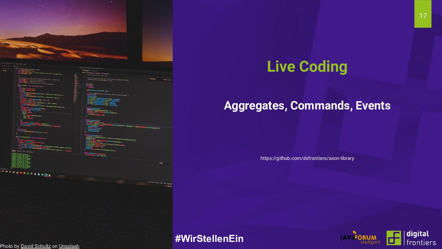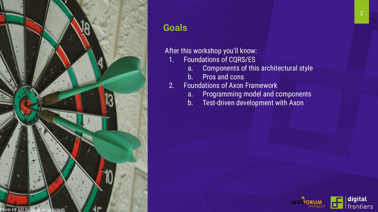CQRS/ES a. Components of this architectural style b. Pros and cons 2. Foundations of Axon Framework a. Programming model and components b. Test-driven development with Axon Photo by Afif Kusuma on Unsplash