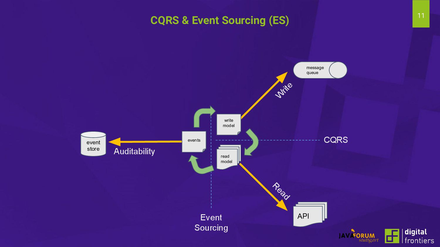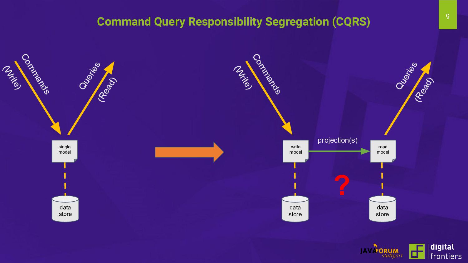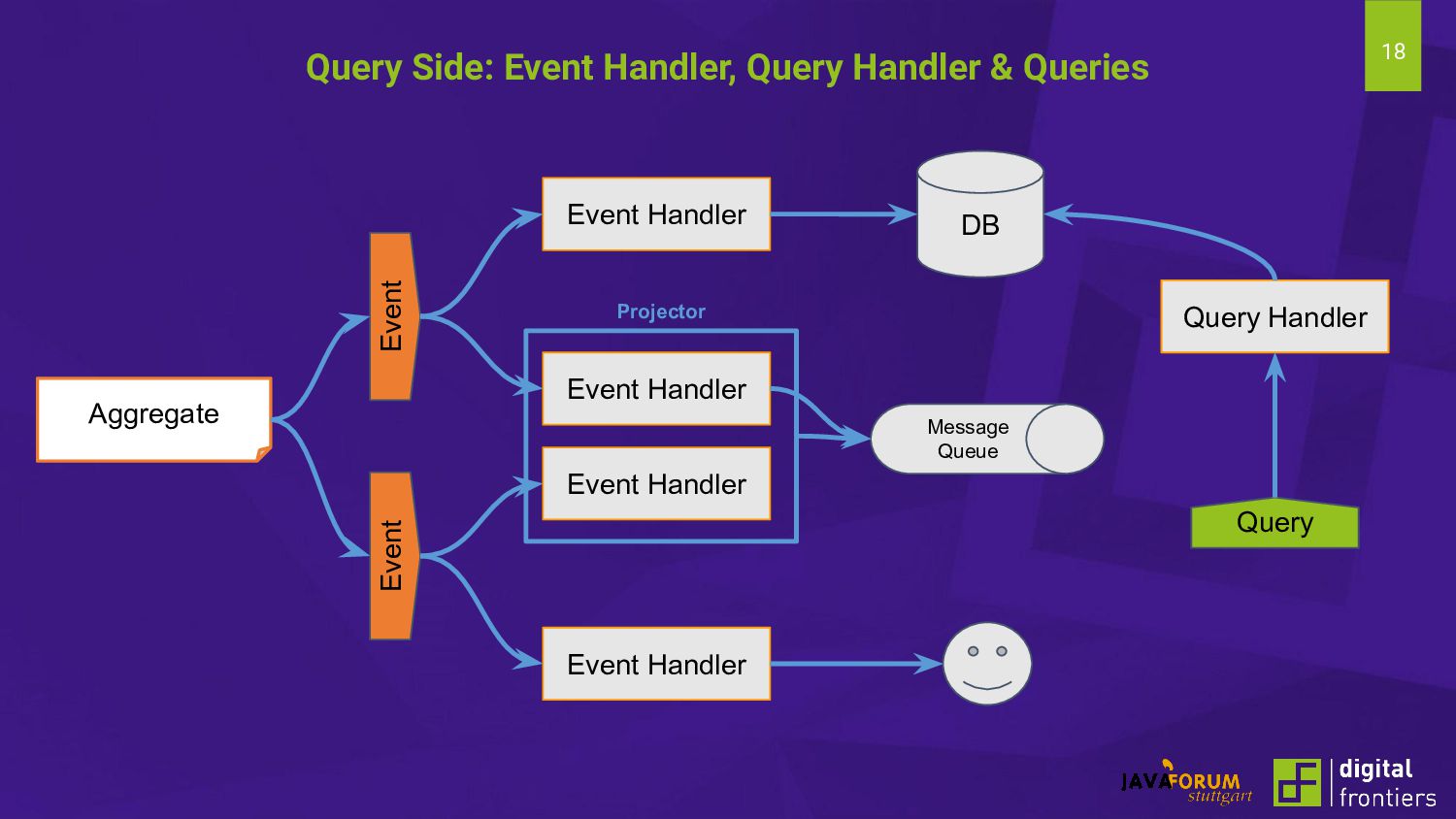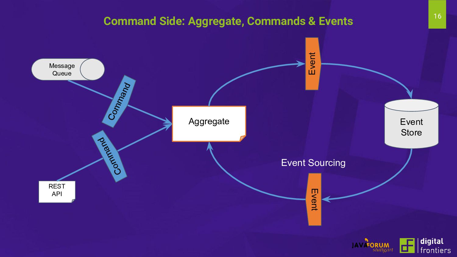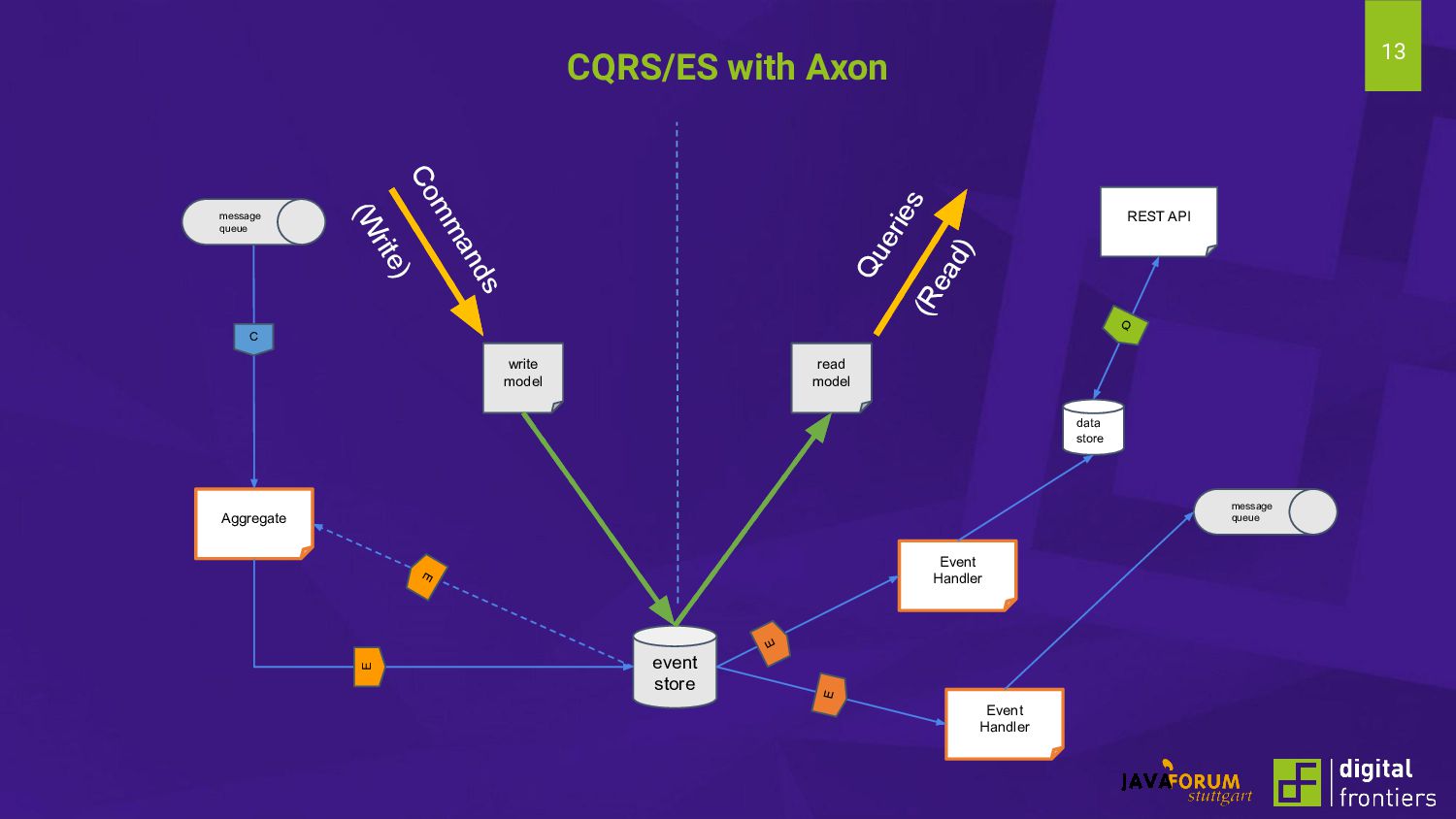 read model event store Aggregate E C Event Handler data store E Event Handler message queue E message queue REST API Q E Commands (Write) write model Queries (Read) read model