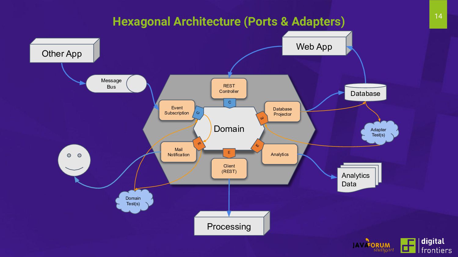 REST Controller Database Projector Event Subscription Message Bus Mail Notification Processing Client (REST) Analytics Analytics Data C C E E E E Domain Test(s) Adapter Test(s) Other App