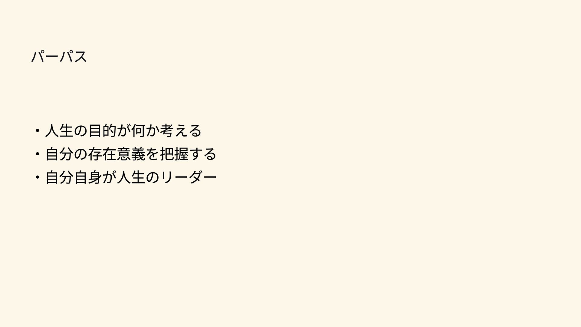 パーパス ・人生の目的が何か考える ・自分の存在意義を把握する ・自分自身が人生のリーダー