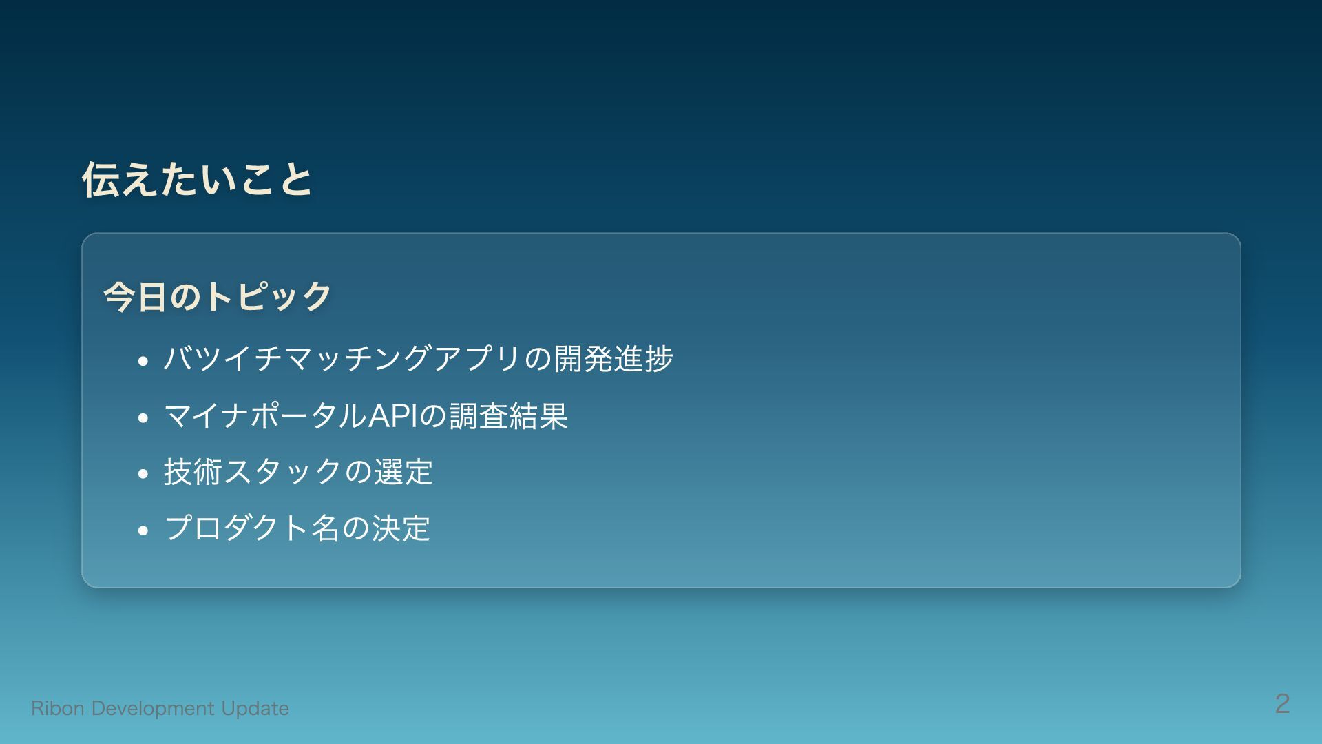 伝えたいこと 伝えたいこと 今日のトピック 今日のトピック バツイチマッチングアプリの開発進捗 マイナポータルAPIの調査結果 技術スタックの選定 プロダクト名の決定 Ribon Development
