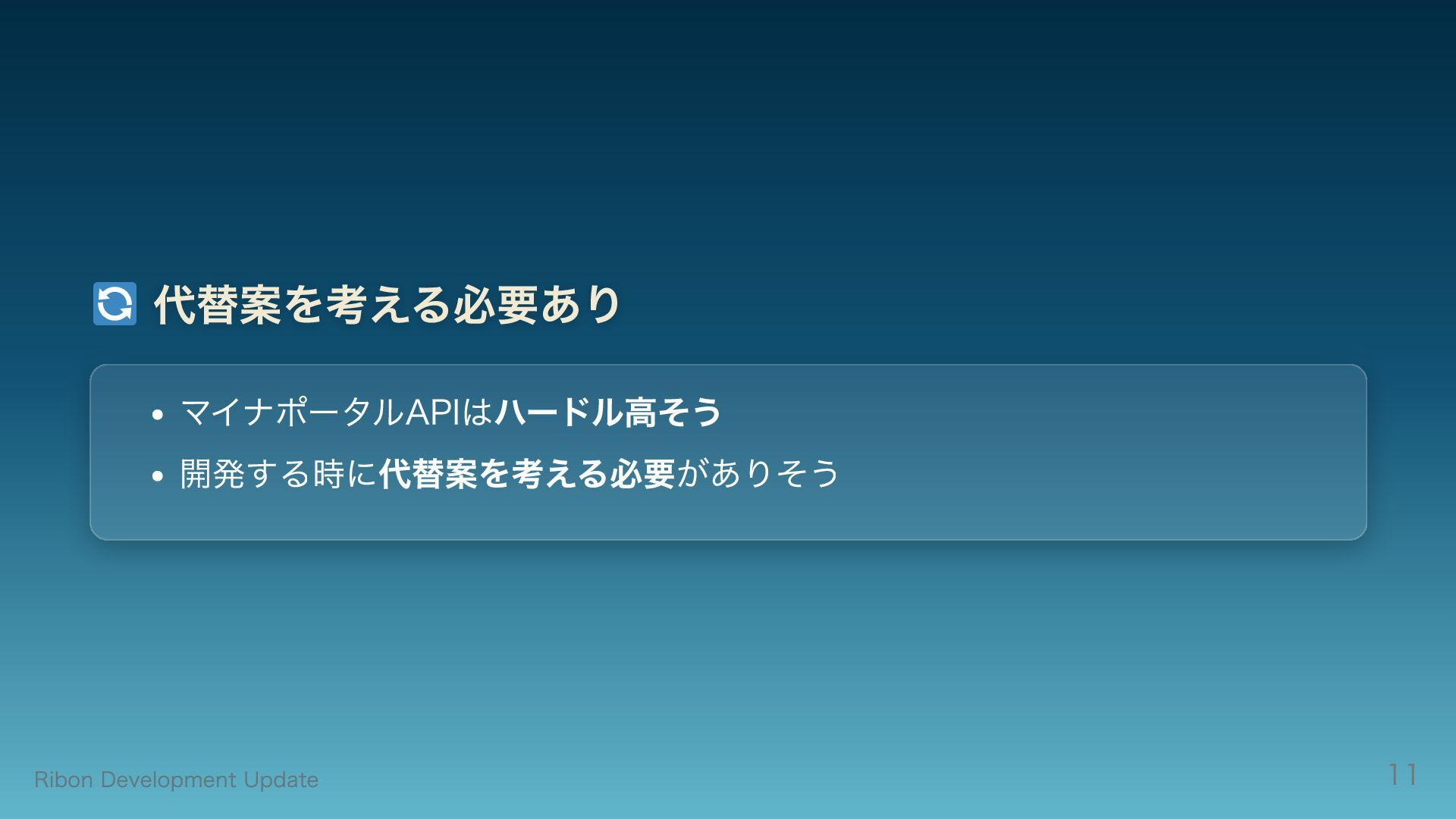 代替案を考える必要あり 代替案を考える必要あり マイナポータルAPIはハードル高そう 開発する時に代替案を考える必要がありそう Ribon Development Update 11