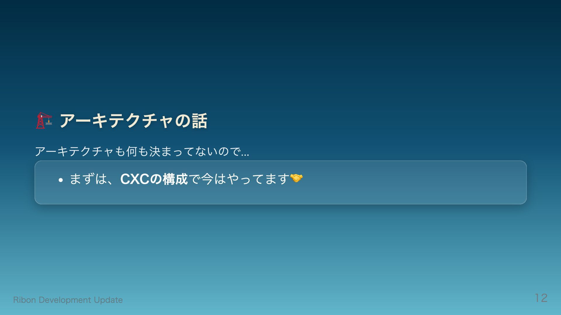 アーキテクチャの話 アーキテクチャの話 アーキテクチャも何も決まってないので... まずは、CXCの構成で今はやってます🤝 Ribon Development Update 12