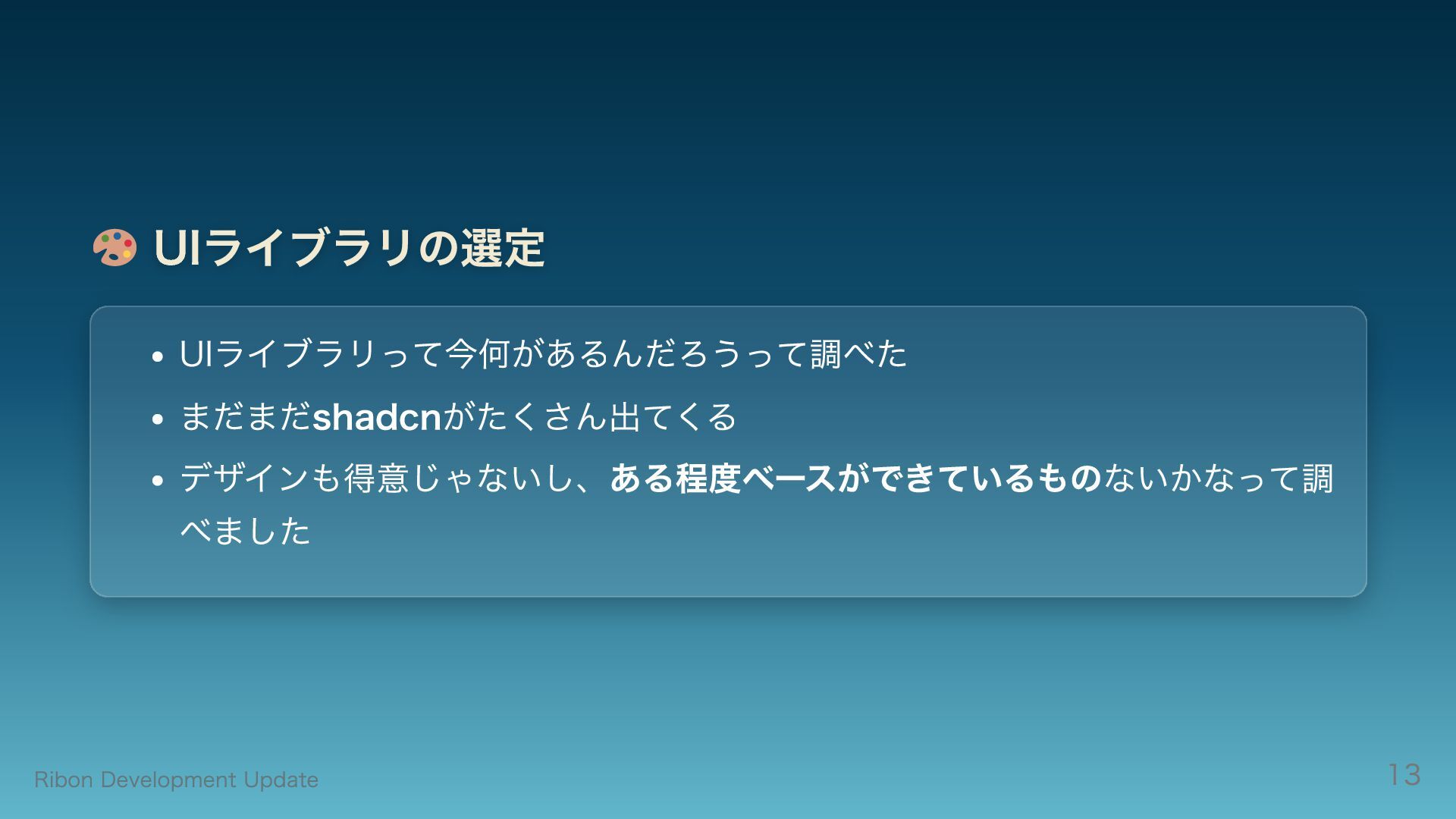 UIライブラリの選定 UIライブラリの選定 UIライブラリって今何があるんだろうって調べた まだまだshadcnがたくさん出てくる デザインも得意じゃないし、ある程度ベースができているものないかなって調 べました Ribon Development Update 13