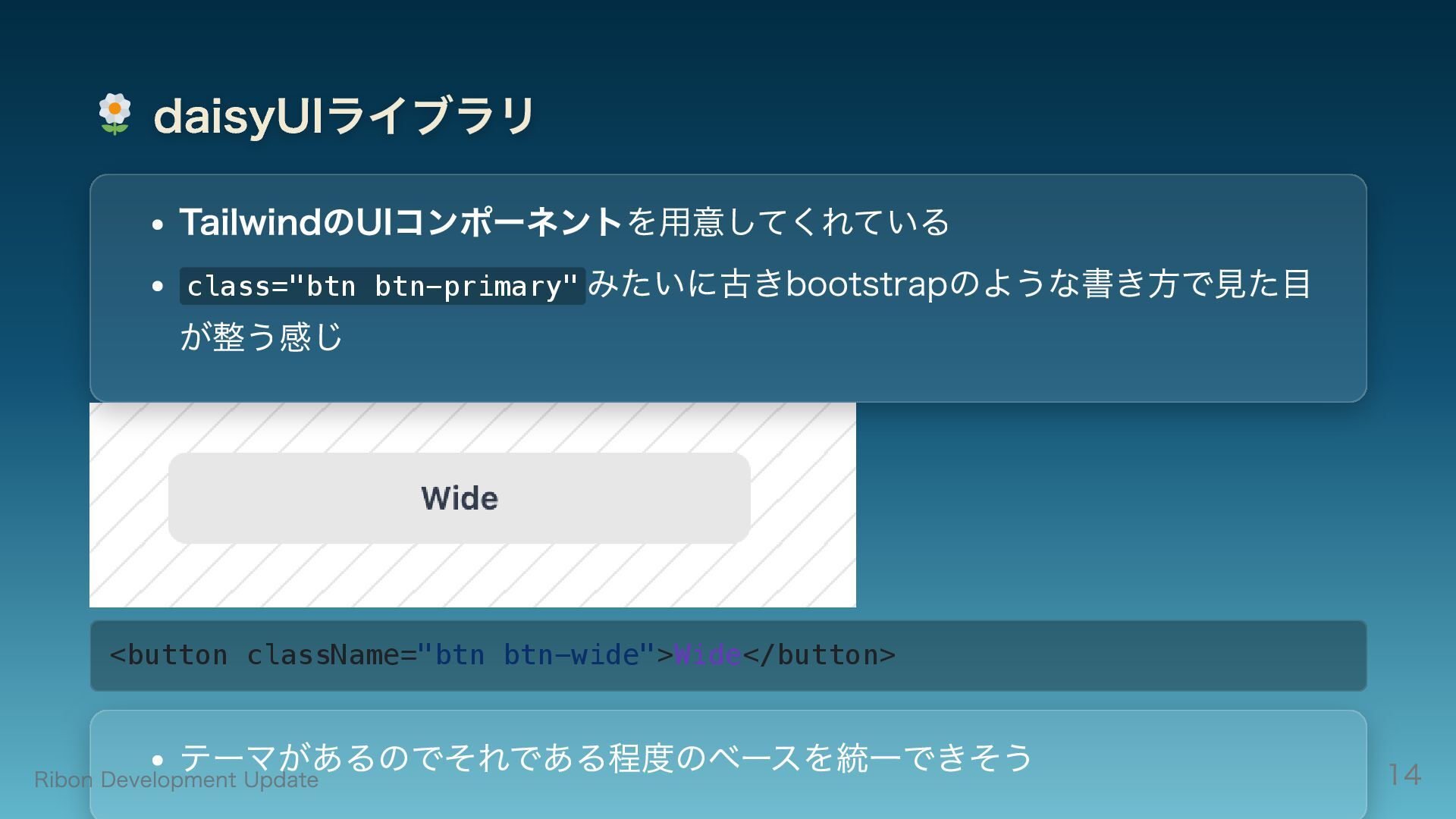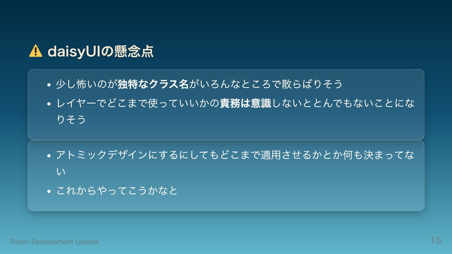 daisyUIの懸念点 daisyUIの懸念点 少し怖いのが独特なクラス名がいろんなところで散らばりそう レイヤーでどこまで使っていいかの責務は意識しないととんでもないことにな りそう アトミックデザインにするにしてもどこまで適用させるかとか何も決まってな い これからやってこうかなと Ribon Development