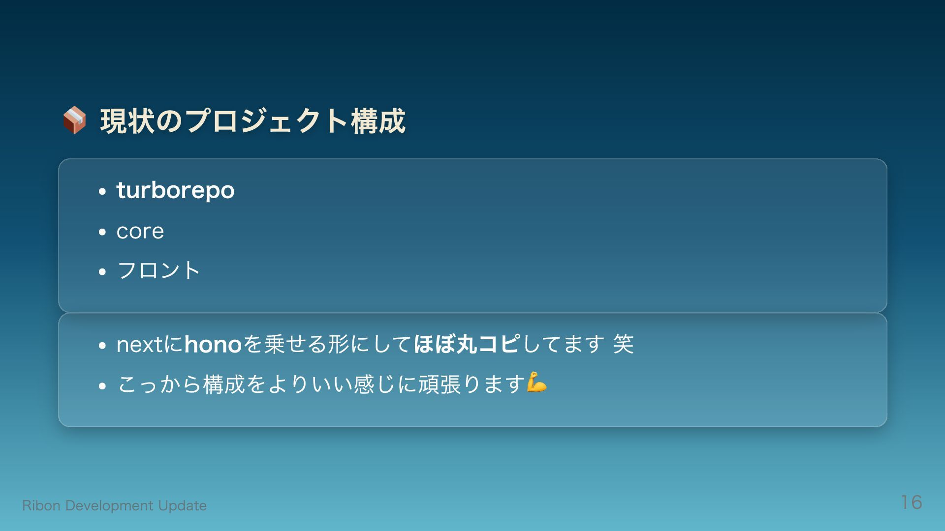 現状のプロジェクト構成 現状のプロジェクト構成 turborepo core フロント nextにhonoを乗せる形にしてほぼ丸コピしてます 笑 こっから構成をよりいい感じに頑張ります💪 Ribon Development