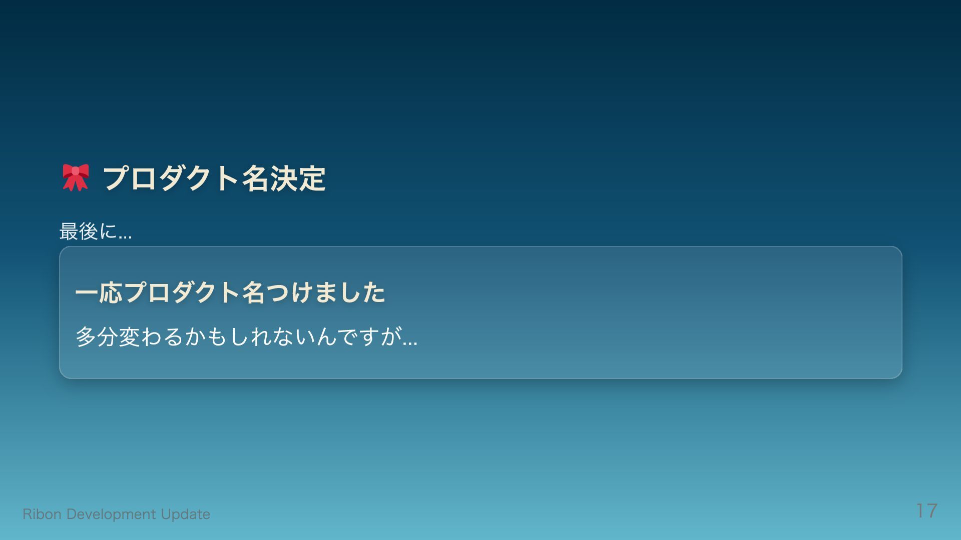 プロダクト名決定 プロダクト名決定 最後に... 一応プロダクト名つけました 一応プロダクト名つけました 多分変わるかもしれないんですが... Ribon Development Update 17