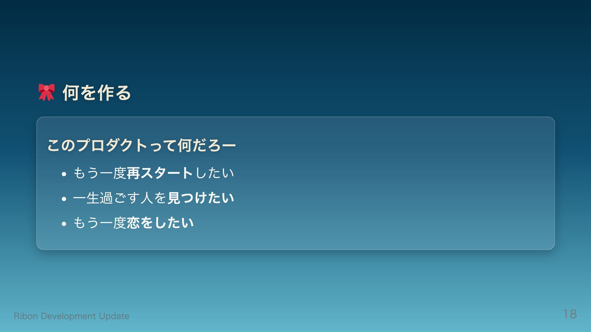 何を作る 何を作る このプロダクトって何だろー このプロダクトって何だろー もう一度再スタートしたい 一生過ごす人を見つけたい もう一度恋をしたい Ribon Development Update