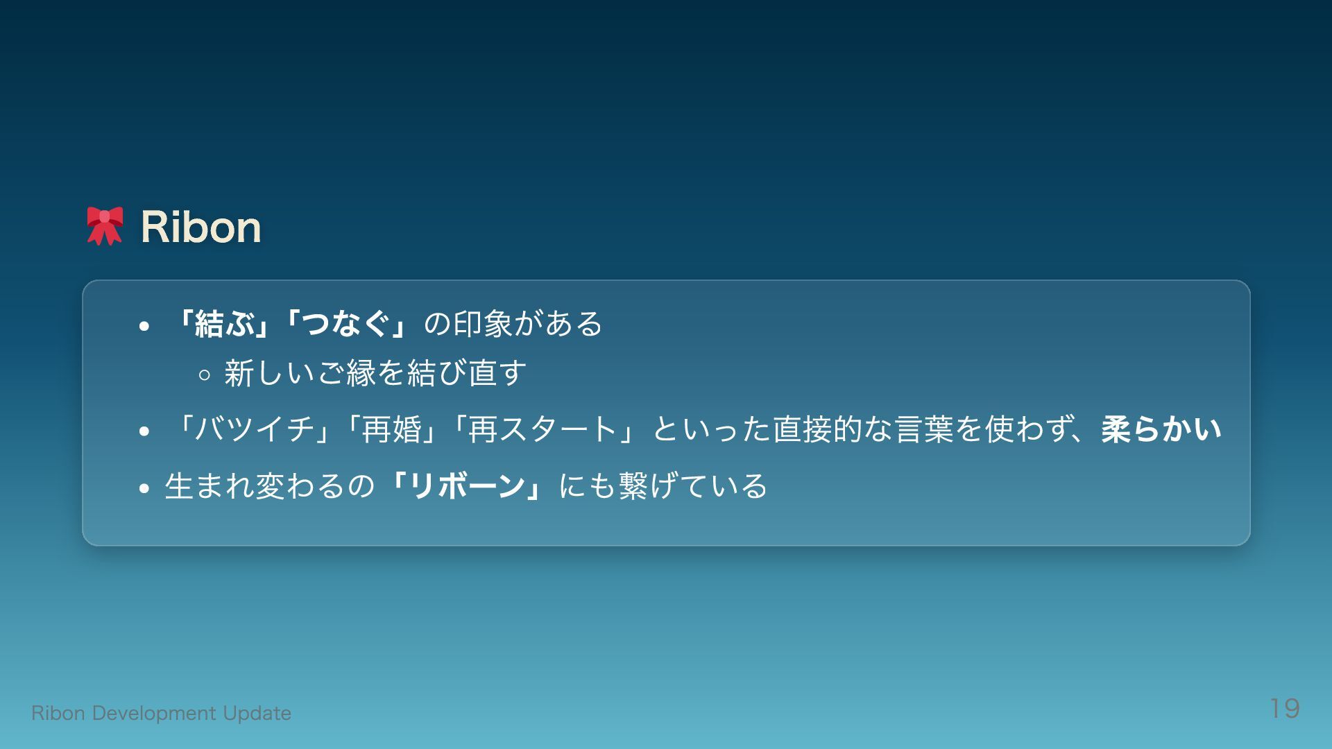 Ribon Ribon 「結ぶ」 「つなぐ」の印象がある 新しいご縁を結び直す 「バツイチ」 「再婚」 「再スタート」といった直接的な言葉を使わず、柔らかい 生まれ変わるの「リボーン」にも繋げている Ribon