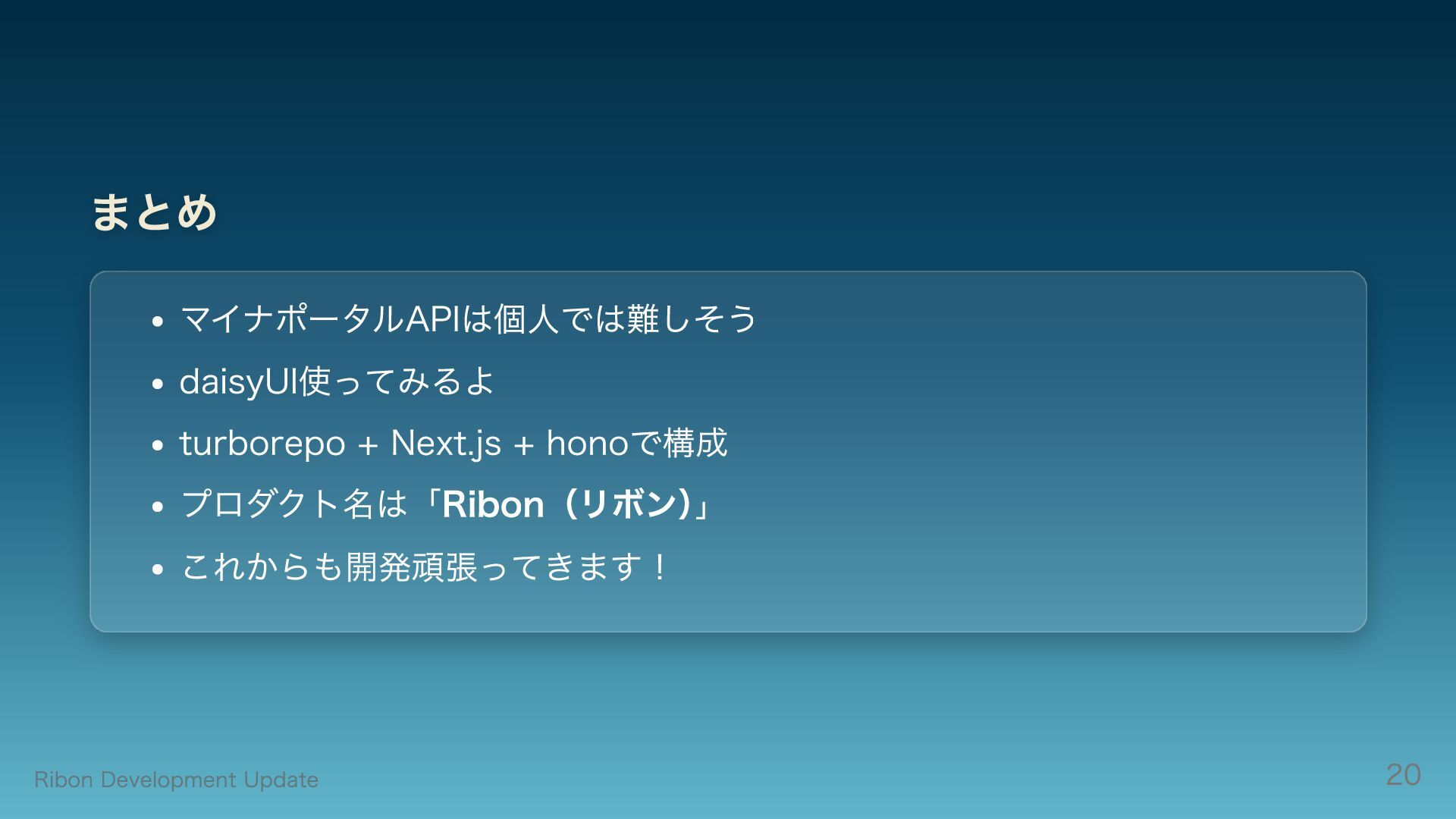 まとめ まとめ マイナポータルAPIは個人では難しそう daisyUI使ってみるよ turborepo + Next.js + honoで構成 プロダクト名は「Ribon(リボン)